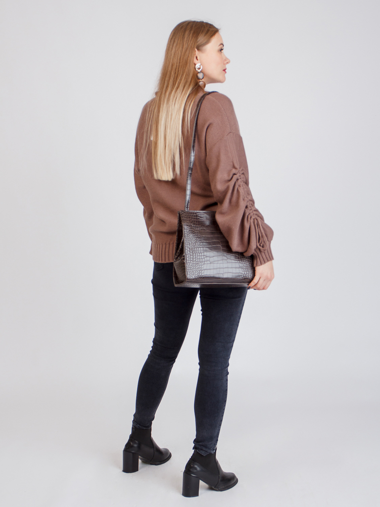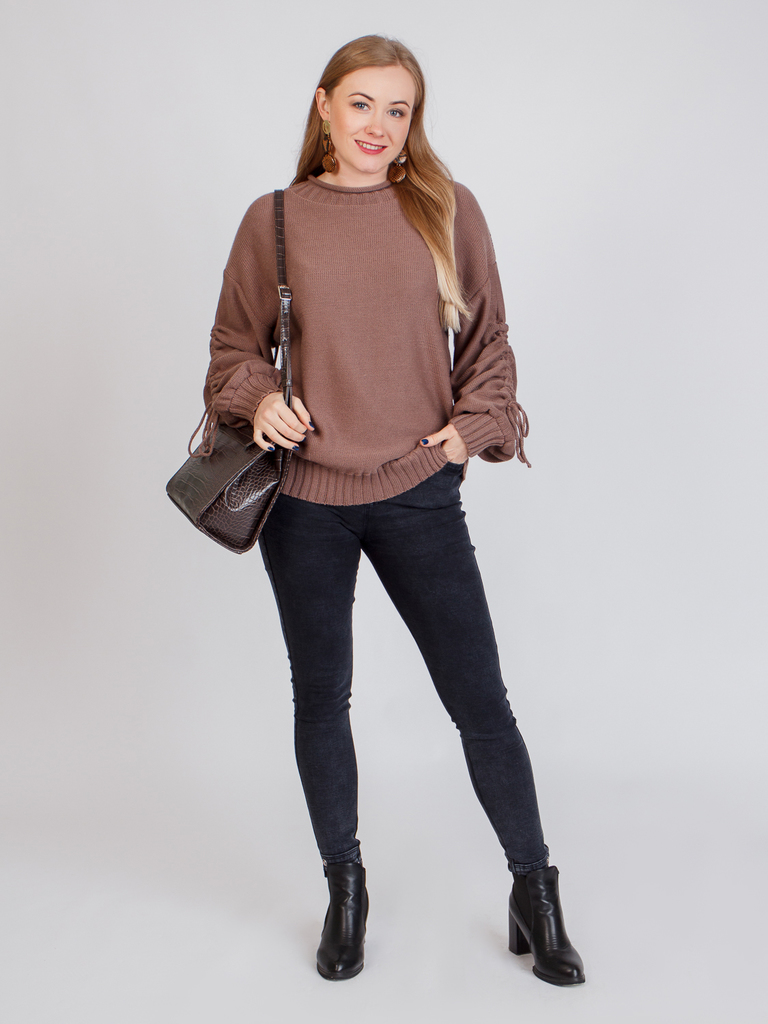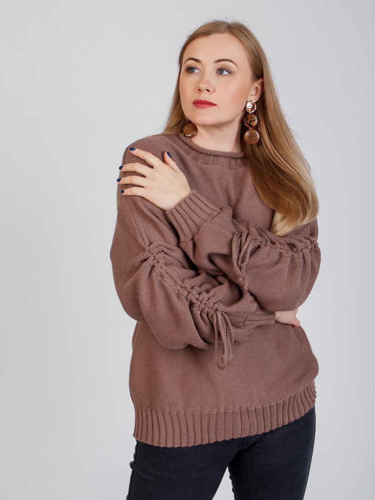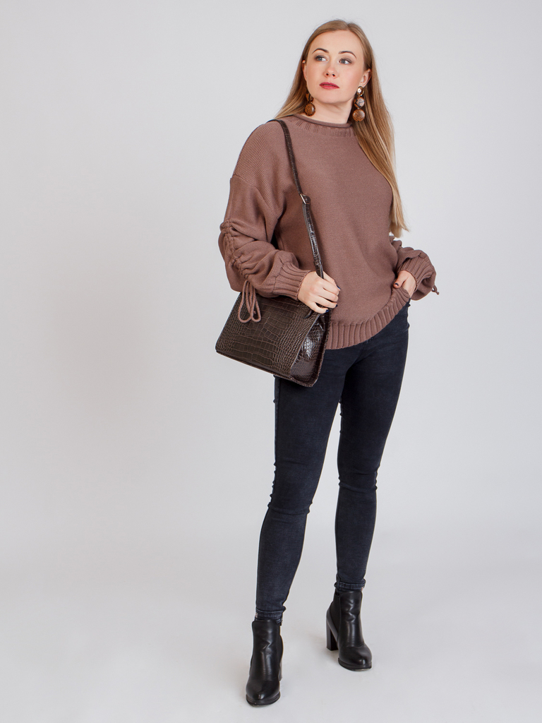 Повседневный вязаный джемпер специально для Вас! Модель выполнена из пряжи. Вязаная одежда всегда актуальна, отличается комфортом и практичностью. Изделия из пряжи займут достойное место в Вашем гарде... Показать описаниеробе и станут прекрасной основой для стильных образов. Джемпер прямого силуэта. Горловина округлая, обработана бейкой-резинкой с руликом. Рукава свободные, по низу с притачной резинкой. Длина рукава регулируется шнуровкой. По низу джемпера - резинка. В изделии использованы цвета: какао. Длина рукава регулируемая - от длинного до 3/4. Длина изделия: 46 размер - 64 ± 2 см 48 размер - 64 ± 2 см 50 размер - 64 ± 2 см 52 размер - 64 ± 2 см 54 размер - 66 ± 2 см 56 размер - 66 ± 2 см 58 размер - 66 ± 2 см При создании образа, который Вы видите на фотографии, также была использована сумка арт.SMK11219. Для просмотра модели введите артикул в строке поиска. Параметры девушки-фотомодели: Рост - 168 см Размер - 48 Обхват груди - 97 ± 1 см Обхват талии - 77 ± 1 см Обхват бёдер - 104 ± 1 см Длина переда до талии - 48 ± 1 см Длина спины до талии - 40 ± 1 см Длина руки - 60 ± 1 см