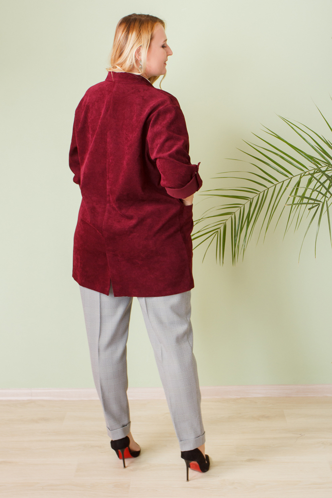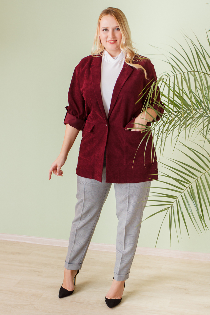 Жакет "оверсайз" станет украшением статусного гардероба истинной модницы! Модель будет удачно гармонировать с различными элементами Вашего гардероба. Жакет прямого силуэта, "оверсайз", с застежкой на ... Показать описаниеодну пуговицу. На передней части изделия накладные карманы с клапаном. На спинке средний шов и шлица. Воротник пиджачного типа. Рукав рубашечный, длинный с трансформацией в 3/4 фиксируется на пату с пуговицей, спущенная линия плеча. В изделии использованы цвета: бордовый Длина рукава (от конечной плечевой точки) - 59 ± 1 см Длина изделия - 79 ± 2 см При создании образа, который Вы видите на фотографии, также были использованы брюки арт.B1518. Для просмотра модели введите артикул в строке поиска. Параметры девушки-фотомодели: Рост - 170 см Размер – 52-54 Обхват груди - 106 ± 1 см Обхват талии - 86 ± 1 см Обхват бёдер - 119 ± 1 см Длина переда до талии – 52 ± 1 см Длина спины до талии - 40 ± 1 см