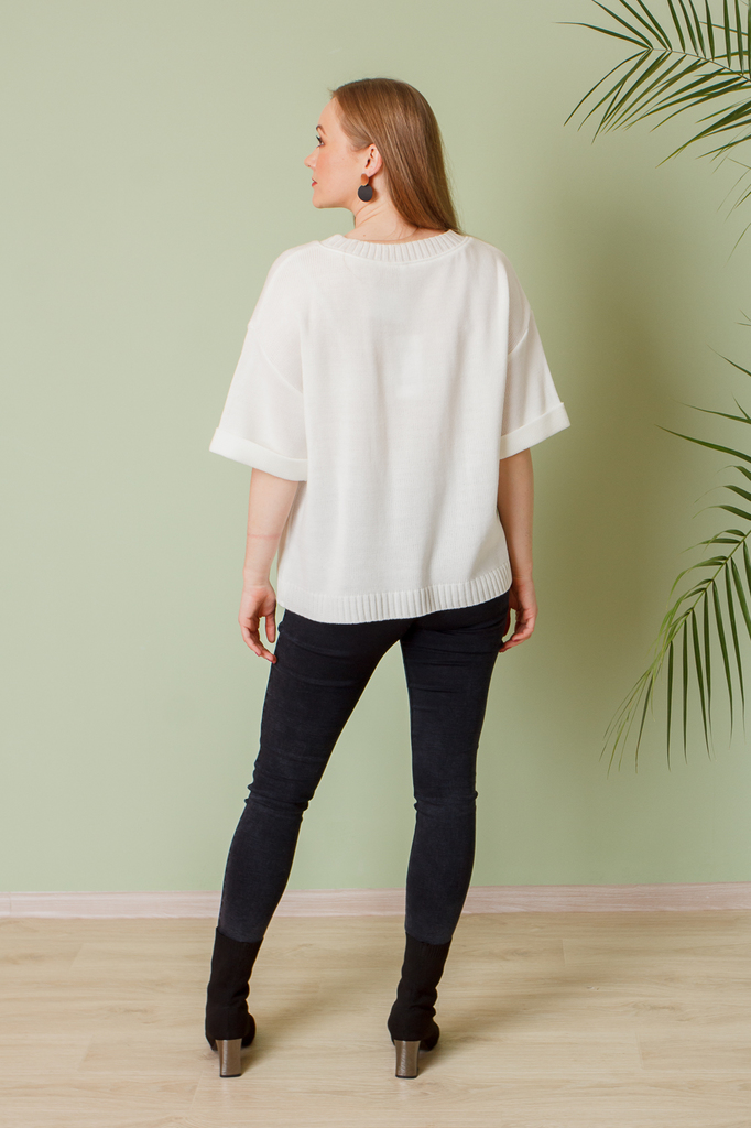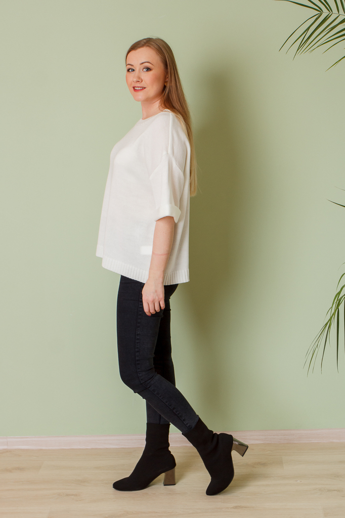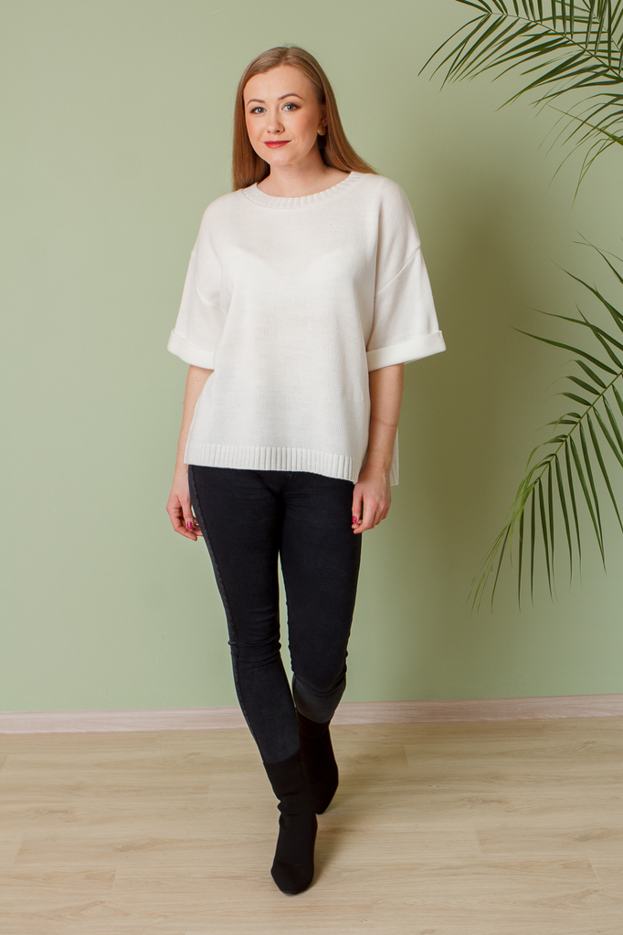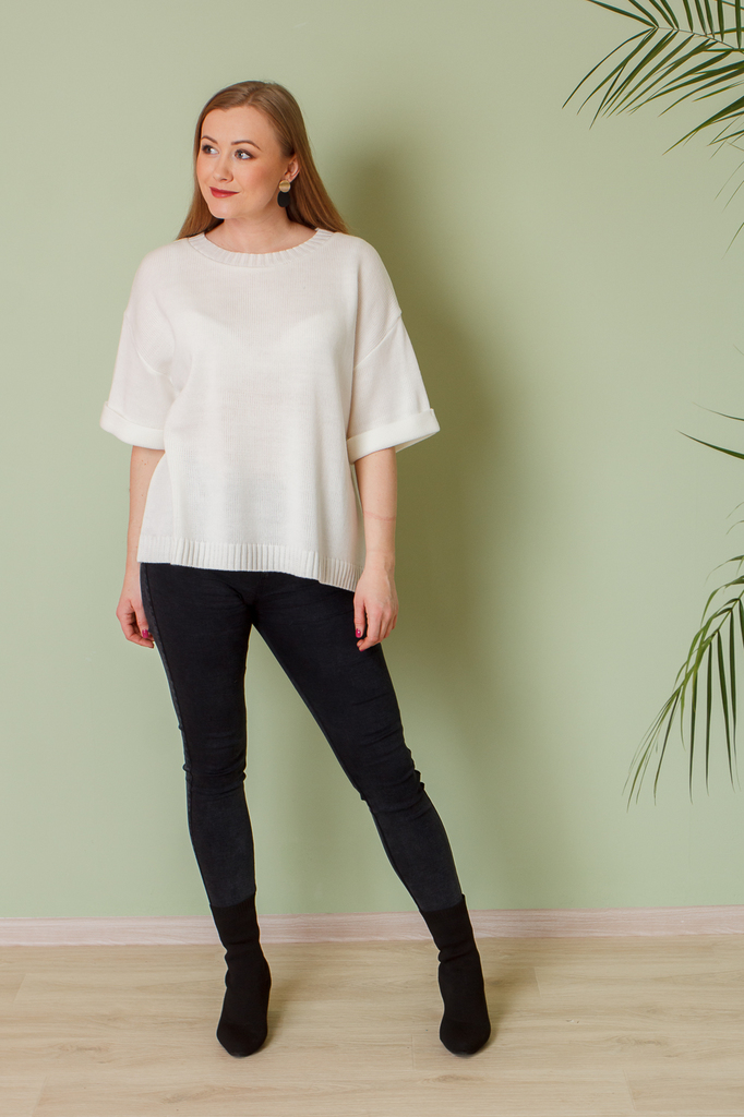 Повседневный вязаный джемпер специально для Вас! Модель выполнена из пряжи. Вязаная одежда всегда актуальна, отличается комфортом и практичностью. Изделия из пряжи займут достойное место в Вашем гарде... Показать описаниеробе и станут прекрасной основой для стильных образов. Джемпер прямого силуэта, "оверсайз". Горловина круглая, обработана бейкой. Рукав рубашечный, до локтя, со спущенной линией плеча и манжетой на отворот. Цвет: Белый. Длина рукава (от конечной плечевой точки) - 31 ± 2 см Длина изделия - 57 ± 2 см Параметры девушки-фотомодели: Рост - 168 см Размер - 48 Обхват груди - 97 ± 1 см Обхват талии - 77 ± 1 см Обхват бёдер - 104 ± 1 см Длина переда до талии - 48 ± 1 см Длина спины до талии - 40 ± 1 см Длина руки - 60 ± 1 см