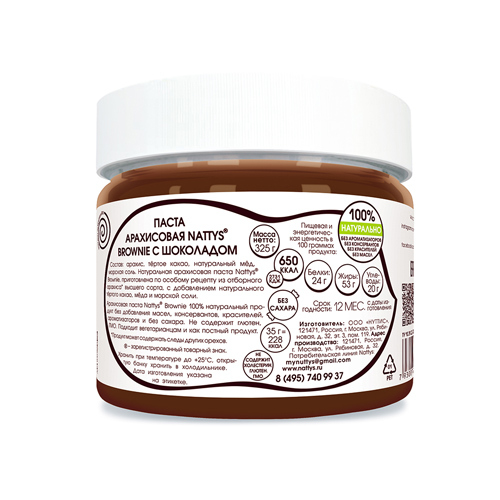 Производитель: Natty'sРоссия; Страна производства: Россия; Пищевая ценность (на 100 г): Белки - 24 г, Жиры - 53 г, Углеводы - 20 г.; Энергетическая ценность (на 100 г): 650 кКал Натуральная арахисовая... Показать описание шоколадная паста Nattys "Brownie" - абсолютно натуральная и очень вкусная: в составе только арахис, натуральное тертое какао, немного мёда и морской соли. Источник белка и правильных растительных жиров. Правильный перекус, вкусный десерт, сытный завтрак - твой Nattys! ОЗНАКОМИТЬСЯ С СОСТАВОМ, СПОСОБОМ ПРИМЕНЕНИЯ И ОТЗЫВАМИ МОЖНО ПО ЭТОЙ ССЫЛКЕ