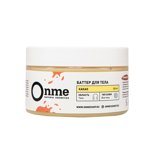 Производитель: OnmeРоссия; Страна производства: Россия Обеспечивает полноценный уход за кожей, требующей увлажнения и питания. Помогает работе гидролипидного барьера кожи, способствует сохранению влаг... Показать описаниеи. Масло какао глубоко смягчает и увлажняет кожу, снимает раздражение и увеличивает выработку коллагена. Масла миндаля и экстракты календулы и лимона ускоряют процесс регенерации клеток, оказывают противовоспалительное, ранозаживляющее, бактерицидное действие, тонизируют и укрепляют капилляры. Обладает насыщенной сливочной текстурой, тающей на коже, и шоколадным ароматом. Все средства Onme имеют сертификат Cruelty Free and Vegan PETA. ОЗНАКОМИТЬСЯ СО СПОСОБОМ ПРИМЕНЕНИЯ И ОТЗЫВАМИ МОЖНО ПО ЭТОЙ ССЫЛКЕ