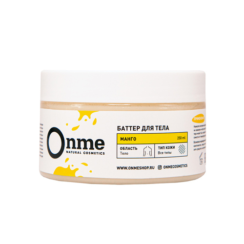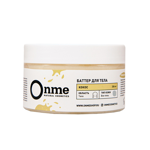 Производитель: OnmeРоссия; Страна производства: Россия Обеспечивает полноценный уход за кожей, требующей восстановления. Помогает работе гидролипидного барьера кожи, предотвращает потерю влаги. Органи... Показать описаниеческое масло кокоса в основе баттера обладает антиоксидантными, питательными и успокаивающими свойствами. Масло миндаля смягчает и ускоряет процесс регенерации клеток. Бисаболол и экстракт ромашки оказывают противовоспалительное, антисептическое и заживляющее действие, благотворно влияют на повреждённую и раздраженную кожу. Обладает насыщенным кокосовым ароматом. Легко впитывается, оставляет кожу бархатистой, гладкой и мягкой. Все средства Onme имеют сертификат Cruelty Free and Vegan PETA. ОЗНАКОМИТЬСЯ СО СПОСОБОМ ПРИМЕНЕНИЯ И ОТЗЫВАМИ МОЖНО ПО ЭТОЙ ССЫЛКЕ