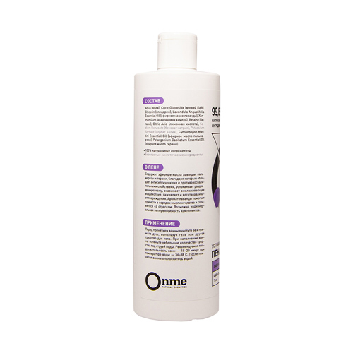 Производитель: OnmeРоссия; Страна производства: Россия Содержит эфирные масла лаванды, пальмарозы и герани, благодаря которым обладает антисептическими и противовоспалительными свойствами, успокаивает... Показать описание раздраженную кожу, оказывает омолаживающее воздействие, заживляет и восстанавливает повреждения. Аромат лаванды помогает привести в порядок мысли и чувства и справиться со стрессом. Не рекомендуется для использования вместо геля для душа. Уровень pH 6,1. ОЗНАКОМИТЬСЯ СО СПОСОБОМ ПРИМЕНЕНИЯ И ОТЗЫВАМИ МОЖНО ПО ЭТОЙ ССЫЛКЕ