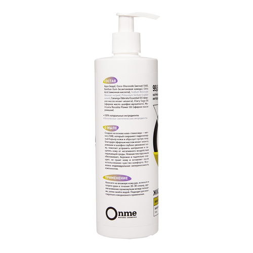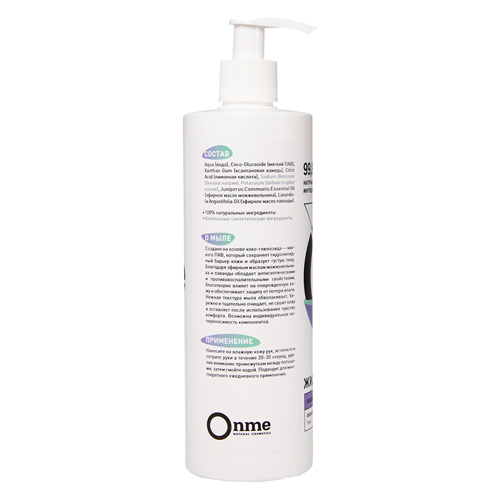 Производитель: OnmeРоссия; Страна производства: Россия; Тип кожи: Для всех типов кожи Создано на основе коко-глюкозида - мягкого ПАВ, который сохраняет гидролипидный барьер кожи и образует густую пену... Показать описание. Благодаря эфирным маслам иланг-иланга, ромашки и шалфея глубоко увлажняет кожу, помогает устранить шелушения и защитить кожу от негативного воздействия окружающей среды. Нежная текстура мыла обволакивает, бережно и тщательно очищает, не сушит кожу и оставляет после использования чувство комфорта. ОЗНАКОМИТЬСЯ СО СПОСОБОМ ПРИМЕНЕНИЯ И ОТЗЫВАМИ МОЖНО ПО ЭТОЙ ССЫЛКЕ