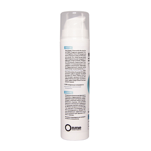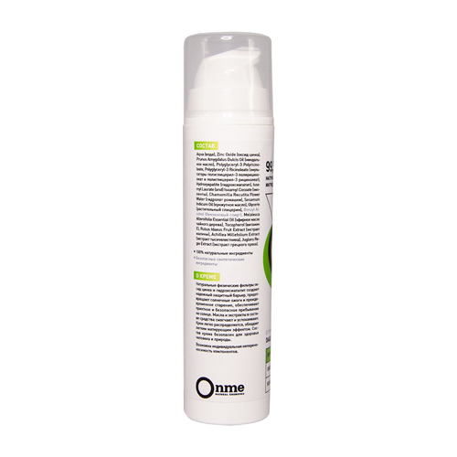 Производитель: OnmeРоссия; Страна производства: Россия; Тип кожи: Для всех типов кожи; Эффект: SPF50 Натуральные физические фильтры оксид цинка и гидроксиапатит создают надежный защитный барьер, предо... Показать описаниетвращают солнечные ожоги и преждевременное старение, обеспечивают приятное и безопасное пребывание на солнце даже для самой светлой кожи. Масла и экстракты в составе средства смягчают и успокаивают. Крем легко распределяется, обладает легким матирующим эффектом. Состав крема безопасен для здоровья человека и природы. Подходит для взрослых и детей с рождения. ОЗНАКОМИТЬСЯ СО СПОСОБОМ ПРИМЕНЕНИЯ И ОТЗЫВАМИ МОЖНО ПО ЭТОЙ ССЫЛКЕ