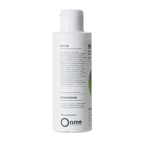 Производитель: OnmeРоссия; Страна производства: Россия; Тип кожи: Все типы кожи / Чувствительная кожа / Жирная кожа; Эффект: Заживление / Тонизирование Средство для ежедневного применения на основе ко... Показать описаниеко-глюкозида — мягкого очищающего компонента, который сохраняет гидролипидный барьер, подходит даже для чувствительной кожи. Гидролат ромашки и эфирное масло чайного дерева снимают раздражение и воспаление, устраняют отечность. Комплекс экстрактов тонизирует, улучшает циркуляцию крови и обменные процессы, заживляет повреждения. Эфирное масло герани разглаживает, улучшает состояние любого типа кожи. Бережно очищает и оставляет после использования чувство комфорта и мягкости. Уровень pH 5,0. ОЗНАКОМИТЬСЯ СО СПОСОБОМ ПРИМЕНЕНИЯ И ОТЗЫВАМИ МОЖНО ПО ЭТОЙ ССЫЛКЕ