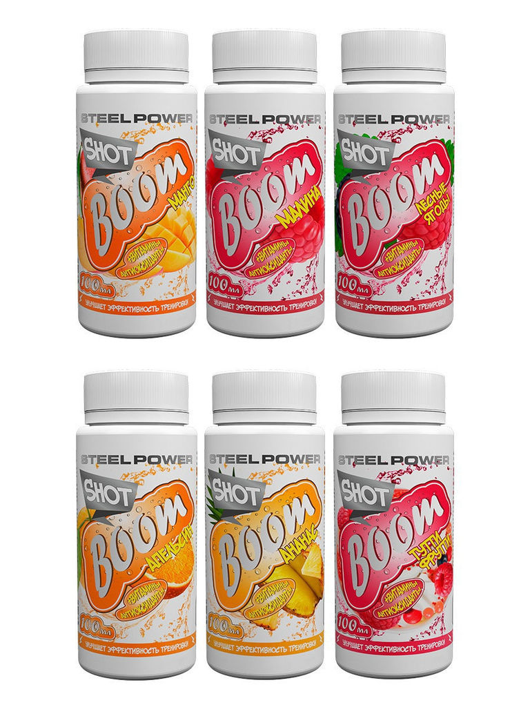 Энерджи BOOM SHOT MIX - 100 мл, 30 бутылочек в коробке (6 вкусов по 5 шт) Вкусы: Малина, Апельсин, Ананас, Тутти Фрутти, Манго, Лесные ягодыВопросы по товару