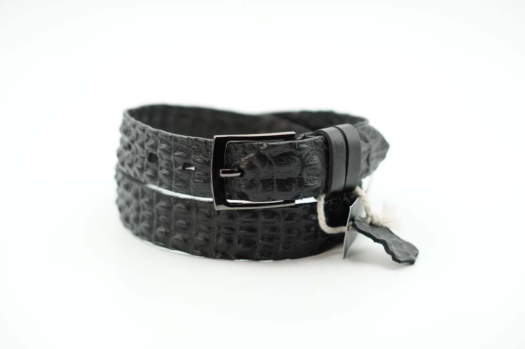 PD-h-0072 Детско-подростковый брючный ремень чёрного цвета из натуральной кожи с объемным рисунком в виде кожи крокодила. Особая обработка и тиснение кожи, позволяет создавать необычные узоры, которые... Показать описание не потеряют форму со временем. Натуральная краска из природных ингредиентов. Хороший вариант в данном ценовом сегменте. Фурнитура (пряжка) может незначительно отличаться от представленной по форме. Регулировка размера с помощью винта. Длина ремня с пряжкой от 80 до 100 см.