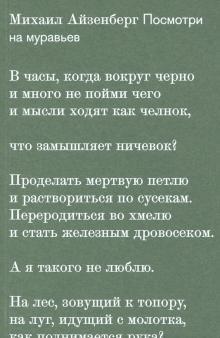 В стихах Михаила Айзенберга с нами как будто говорит не привычное лирическое "я", но скрытые силы самого языка - на наших глазах из средства описания мира язык претворяется в его полноправную часть, т... Показать описаниеакую же, как дерево или воздух, и обретает собственный голос. Вот почему в этих стихах всегда столько нового для нас: у языка есть свое знание о мире, у Айзенберга оно становится достоянием человека. Рейтинг на сайте labirint.ru: 10.00. Больше картинок и возможность полистать книгу на странице.