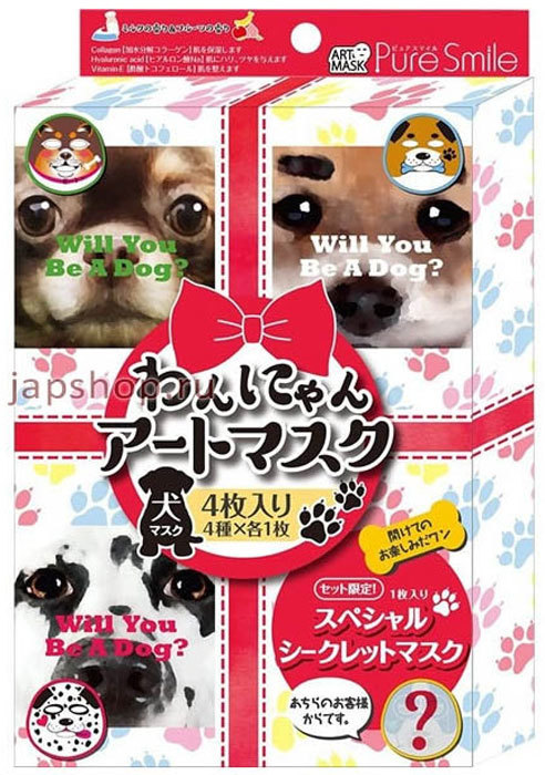 047421 "PURE SMILE" "Art Mask" Набор концентрированных увлажняющих и смягчающих масок для лица с молочными экстрактами и эктсрактами фруктов, с коллагеном, гиалуроновой кислотой и витамином Е, с рисунком (сиба-ину, далматин, чихуахуа, бульдог), 27 мл*4 штВопросы по товару