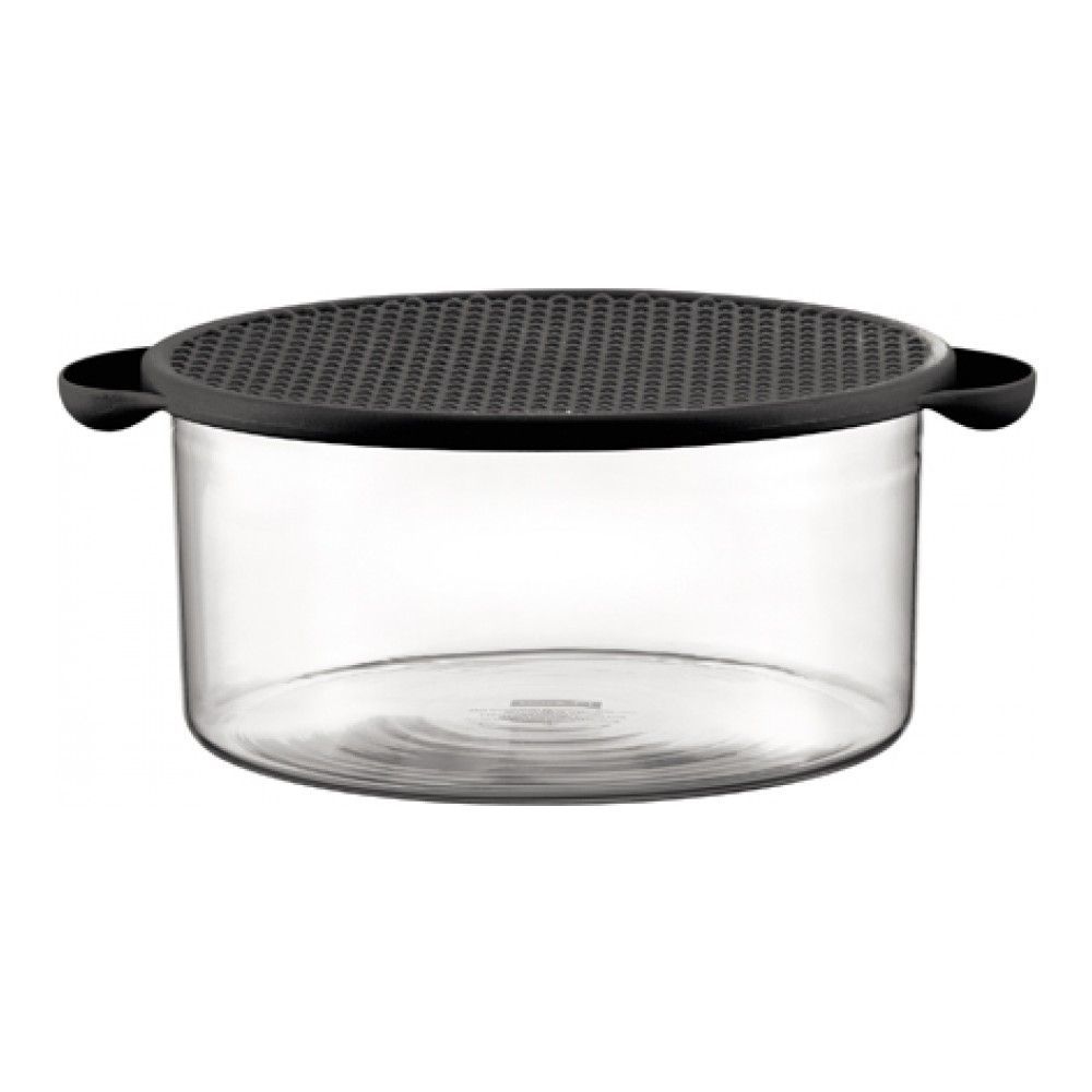 Цвет: черный; объем: 2.50 л; габариты: 22.5x22.5x11.7 см; вес: 0.60 кг; материал: силикон, стекло; серия: Hot Pot. BODUM больше сотни лет не отступает от своего главного правила: создавать не только к... Показать описаниеачественные и уникальные предметы для кухни, сделанные из редких материалов, но и наполнять каждый из них дополнительным смыслом, расширять его функционал. Подобная история и с этой замечательной емкостью для хранения BODUM Hot Pot (англ. «горячий горшочек»). С виду по фотографии она похожа на обычный контейнер, в которых некоторые из нас привыкли брать на работу, например, суп. Но, на самом деле, даны предмет содержит в себе массу дополнительных свойств, которые не присущи ни одному из имеющихся у нас до этого контейнеров. Во-первых, сама емкость целиком сделана из уникального материала – боросиликатного стекла, которое при кажущейся тонкости стенок на самом деле обладает огромным запасом прочности. Боросиликатное стекло не боится практически никакого достижимого в домашних условиях нагрева. Крышка емкости, которая также может быть использована как подставка, изготовлена из силикона, и выдерживает температуру до 220 градусов. Благодаря этим высокопрочным материалам, емкости Hot Pot подлежат к использованию как в духовке, например, в качестве формы для запекания пирога или мяса по-французски, так и на всех видах плит. Литраж емкости – 2,5 л, диаметр – 22 см, высота – 10,5 см.
