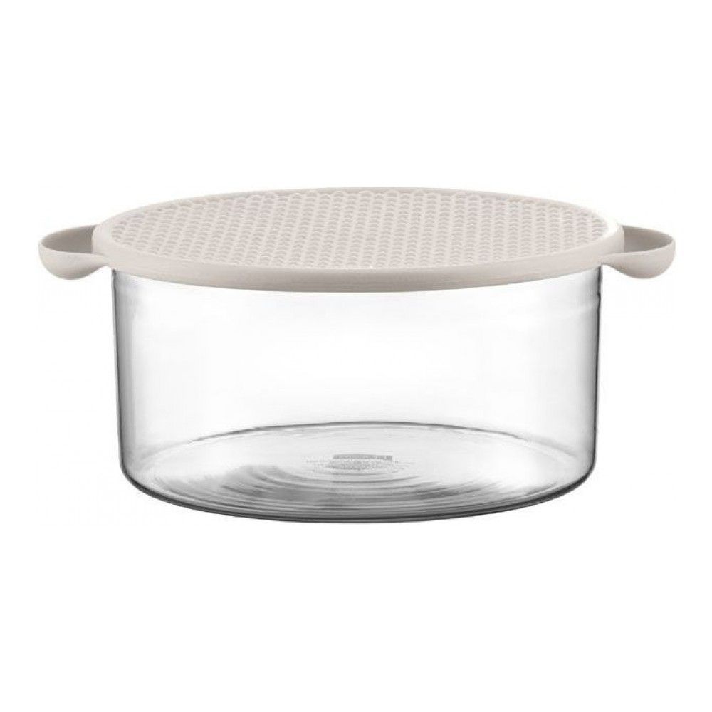Цвет: белый; объем: 2.50 л; габариты: 22.5x22.5x11.7 см; вес: 0.60 кг; материал: силикон, стекло; серия: Hot Pot. BODUM больше сотни лет не отступает от своего главного правила: создавать не только ка... Показать описаниечественные и уникальные предметы для кухни, сделанные из редких материалов, но и наполнять каждый из них дополнительным смыслом, расширять его функционал. Подобная история и с этой замечательной емкостью для хранения BODUM Hot Pot (англ. «горячий горшочек»). С виду по фотографии она похожа на обычный контейнер, в которых некоторые из нас привыкли брать на работу, например, суп. Но, на самом деле, даны предмет содержит в себе массу дополнительных свойств, которые не присущи ни одному из имеющихся у нас до этого контейнеров. Во-первых, сама емкость целиком сделана из уникального материала – боросиликатного стекла, которое при кажущейся тонкости стенок на самом деле обладает огромным запасом прочности. Боросиликатное стекло не боится практически никакого достижимого в домашних условиях нагрева. Крышка емкости, которая также может быть использована как подставка, изготовлена из силикона, и выдерживает температуру до 220 градусов. Благодаря этим высокопрочным материалам, емкости Hot Pot подлежат к использованию как в духовке, например, в качестве формы для запекания пирога или мяса по-французски, так и на всех видах плит. Литраж емкости – 2,5 л, диаметр – 22 см, высота – 10,5 см.
