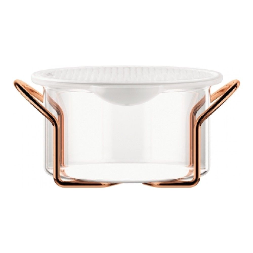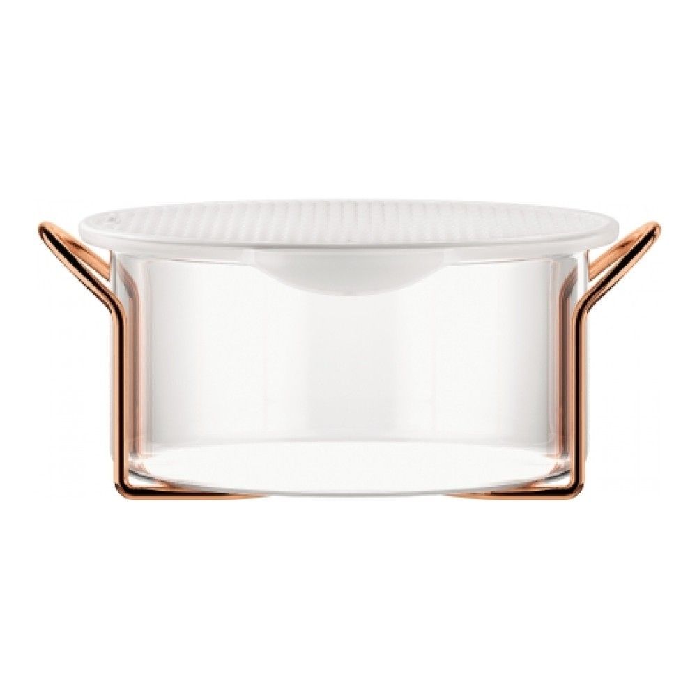 Цвет: медный; объем: 0.25 л; габариты: 10.5х10.5х6 см; вес: 0.17 кг; материал: силикон, коррозионностойкая сталь, стекло; серия: Hot Pot. Эта стеклянная емкость не входит в редкую серию предметов BODU... Показать описаниеM в оправах медного цвета. Вся серия и эта емкость в частности, выдержана в стилистике легкого ретро. Медные серии встречаются у BODUM не часто, тиражи таких предметов невелики. Металлические оправы несут не только декоративную функцию, они предохраняют стеклянные колбы от случайных ударов. Сама же колба сделана не из обычного стекла, а боросиликатного. Оно выглядит более глянцевым, чем обычное, кроме того оно не тускнеет со временем. Боросиликатное стекло е мутнеет и не царапается, сколько бы вы его ни мыли. Это термостойкое стекло, вы можете вынуть колбу из рамы и приготовить, разогреть или заморозить в ней пищу. Силиконовая крышка герметично закрывает емкость, то бы вы в ней ни хранили, продукт не обветрится и не впитает посторонних запахов. Крышку можно использоввать при запекании в духовке, а так же в качестве прихватки или подставки под горячую емкость.