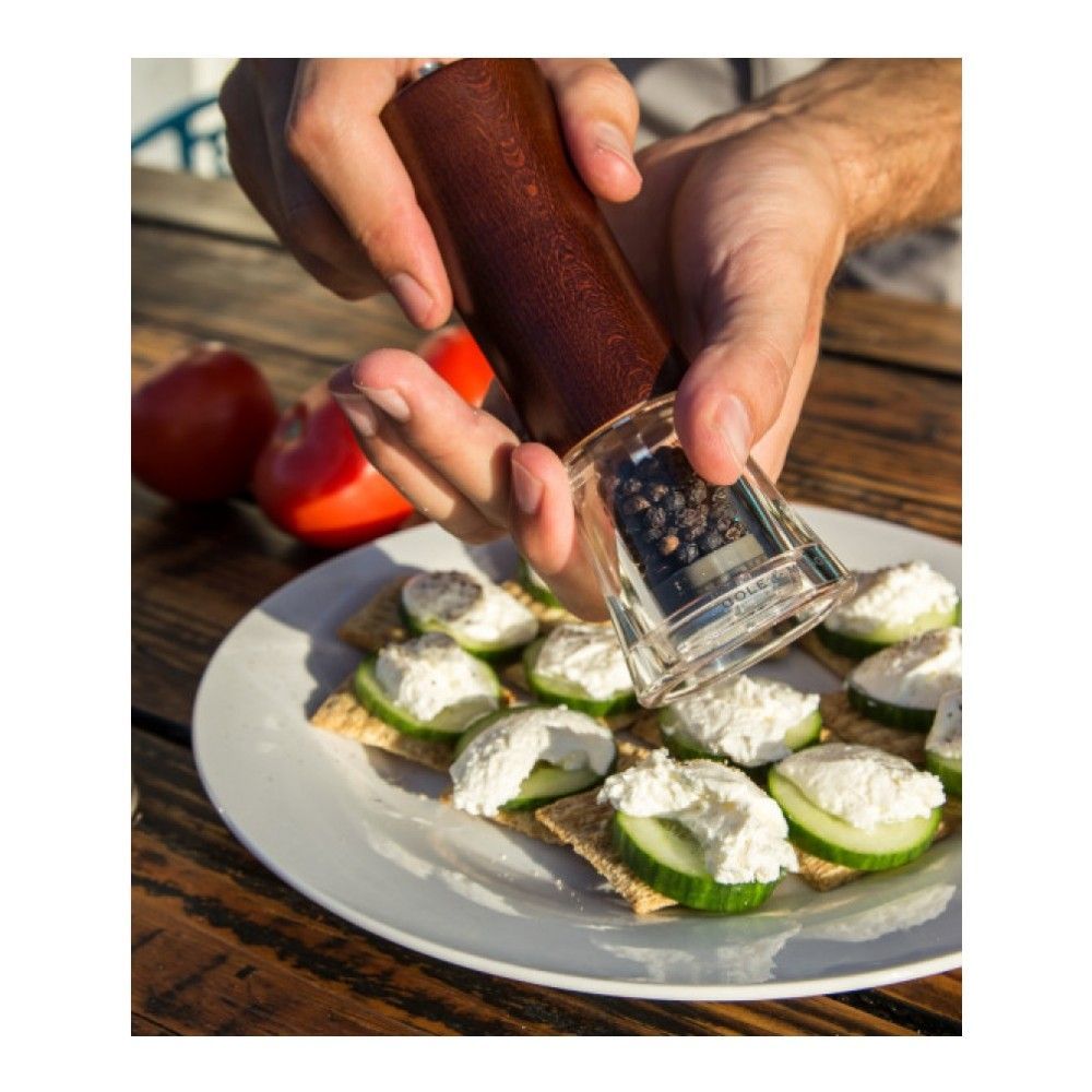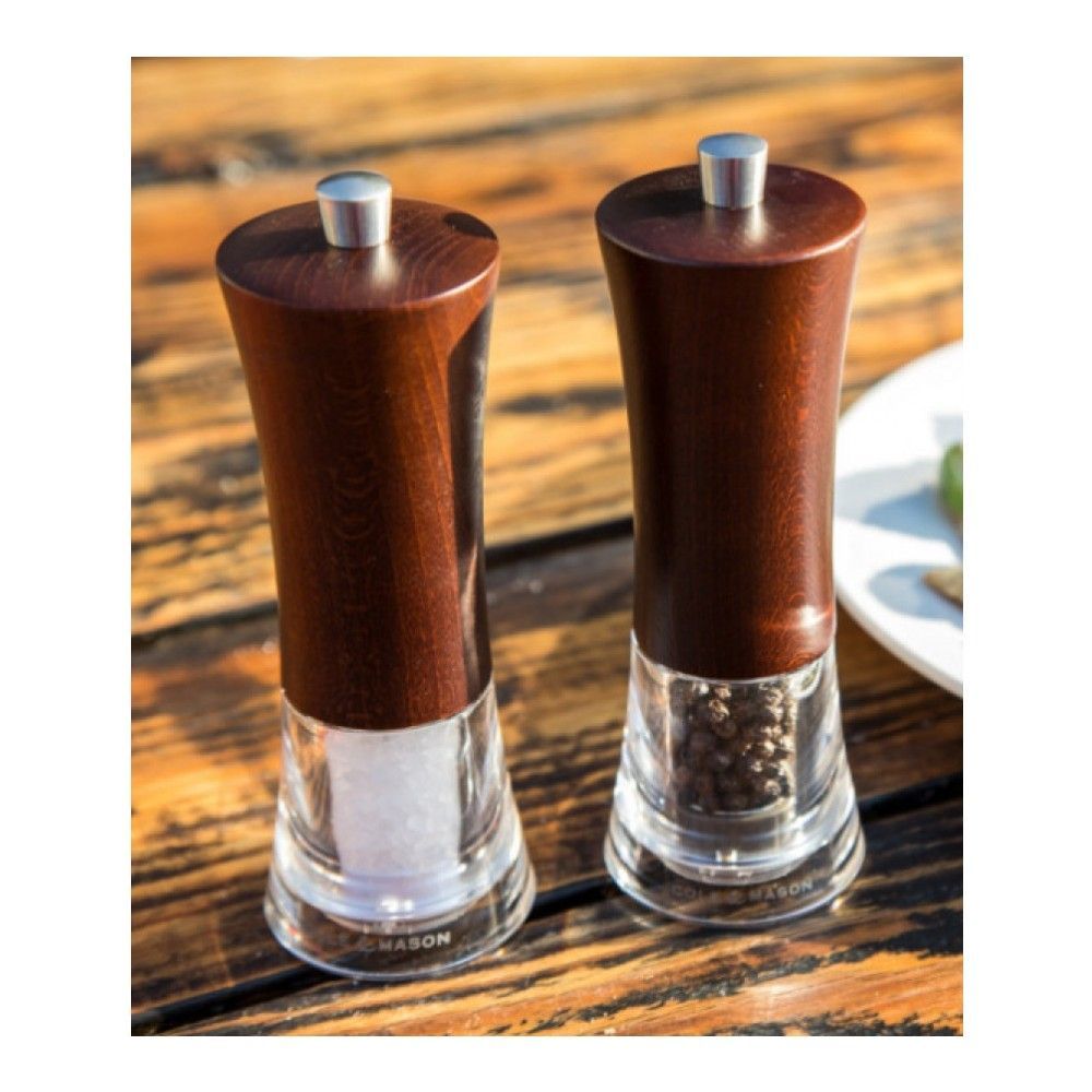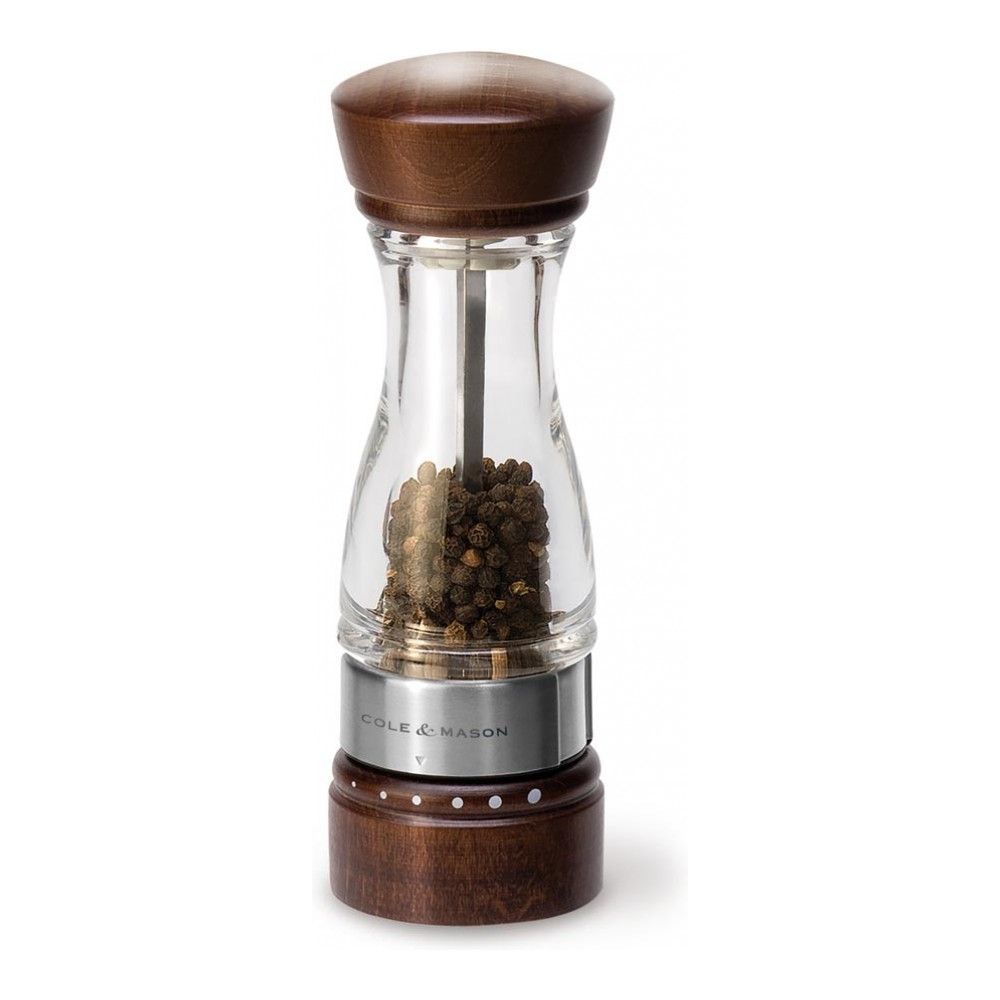 Цвет: темное дерево; габариты: 5x5x18 см; вес: 0.17 кг; материал: коррозионностойкая сталь, акрил, дерево; серия: Tower. Классическая мельница для перца с прозрачным корпусом – вы всегда можете видеть... Показать описание сколько специй осталось внутри. В нижней части мельницы есть точки–отметки, указывающие на степень измельчения специй, переключение осуществляется поворотом нижней части корпуса. Для удобства использования регулятор помола вращается по кругу. Он позволяет изменять величину помола – от мелкой пыли для приправы до крупной фракции для маринадов. Вы можете установить 6 степеней помола. Главное достоинство мельниц компании Cole & Mason – это пожизненная гарантия на механизм помола. Механизм помола для перца сделан из высокоуглеродистой (карбоновой) стали. Высокоуглеродистая сталь – это сталь с улучшенными характеристиками, потому что в ее состав добавлен углерод для усиления прочности. Изделия из такой стали прослужат долгие годы. Лезвия из высокоуглеродистой стали имеют специальную заточку, наилучшим образом подходящую для нарезки горошин черного перца. Это позволяет ножу оставаться острым на всем протяжении срока службы. Достоинства и преимущества. * Пожизненная гарантия на механизм помола;. * Лезвия остаются острыми на всем протяжении срока службы;. * Возможность выбора величины помола: 6 степеней;. * Корпус из прозрачного акрила позволяет видеть содержимое;. * Легко наполнить – достаточно снять крышку.