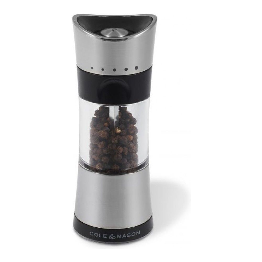 Цвет: хром; габариты: 5x5x18.5 см; вес: 0.41 кг; материал: коррозионностойкая сталь, акрил, керамика; серия: Steel. Эта красивая мельница будет хороша в любом интерьере. Необычное сочетание пластика и... Показать описание металла, удобная форма и отличный нож для измельчения специй, не теряющий своей остроты с годами сделали эту мельницу бестселлером. Устройство для измельчения соли выполнено из циркониевой керамики, которая гарантирует защиту механизма от окисления, что обеспечивает долгую службу мельницы. Достоинства и преимущества. * Мельница выполнена из высококачественного акрила и матового хрома;. * Изделие прозрачное, что позволяет видеть количество оставшихся специй внутри;. * Регулируемые уровни помола – от грубого до самого тонкого;. * Четкая дозировка – вы не ошибетесь с количеством приправ;. * Пожизненная гарантия на механизм от Cole & Mason.