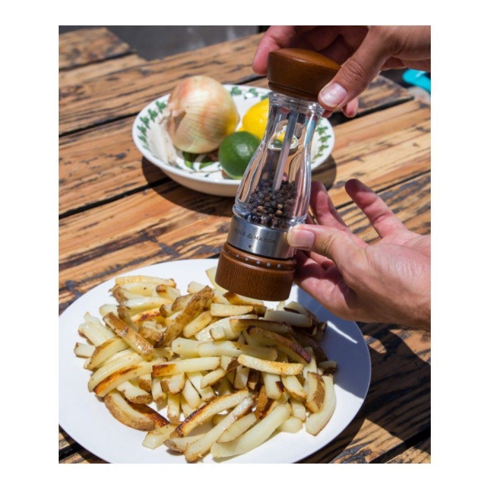 Цвет: прозрачный; габариты: 5х5х13 см; вес: 0.27 кг; материал: пластик, коррозионностойкая сталь; серия: Geometry. Серия мельниц для соли и перца Kempton Cole & Mason идеально подойдет современном... Показать описаниеу интерьеру. Красивый прозрачный корпус из акрила и форма с приятно скругленными углами — фирменные черты серии. Такую мельницу приятно держать в руке, а прозрачность стенок позволит вам всегда знать, сколько перца и соли осталось внутри. Марка Cole & Mason получила известность благодаря необыкновенно высокому качеству механизмов помола. На них бренд дает пожизненную гарантию. Ножи мельниц не будут тупится со временем благодаря фирменному методу заточки Cole & Mason. Мельницы серии Kempton имеют функцию регулировки помола от крупных аппетитных крупинок до порошкообразной консистенции. В моделях предназначенных для соли использован керамический механизм помола лезвиями алмазной заточки. Такие лезвия аккуратно измельчает кристаллы соли, не превращая их в пыль. Модели предназначенные для помола перца имеют высококачественный стальной механизм. Мельницы Cole & Mason Kempton поставляются в Россию ограниченным тиражом и продаются эксклюзивно в магазине DOMOS. Достоинства и преимущества. * Корпус из легко моющегося современного материала — акрила;. * Прозрачные стенки позволяют следить за количеством специй внутри мельницы;. * Легкая система наполнения мельницы - просто отвинтите набалдашник наверху и откройте мельницу;. * Возможность регулировать помол от крупного до мелкого;. * Высокое качество измельчающего механизма. Пожизненная гарантия на механизм.