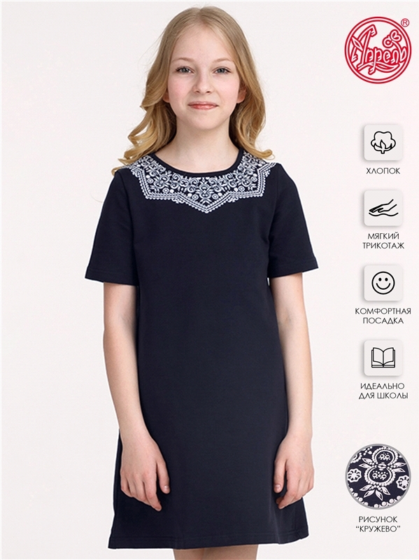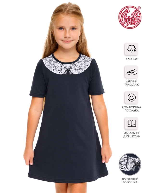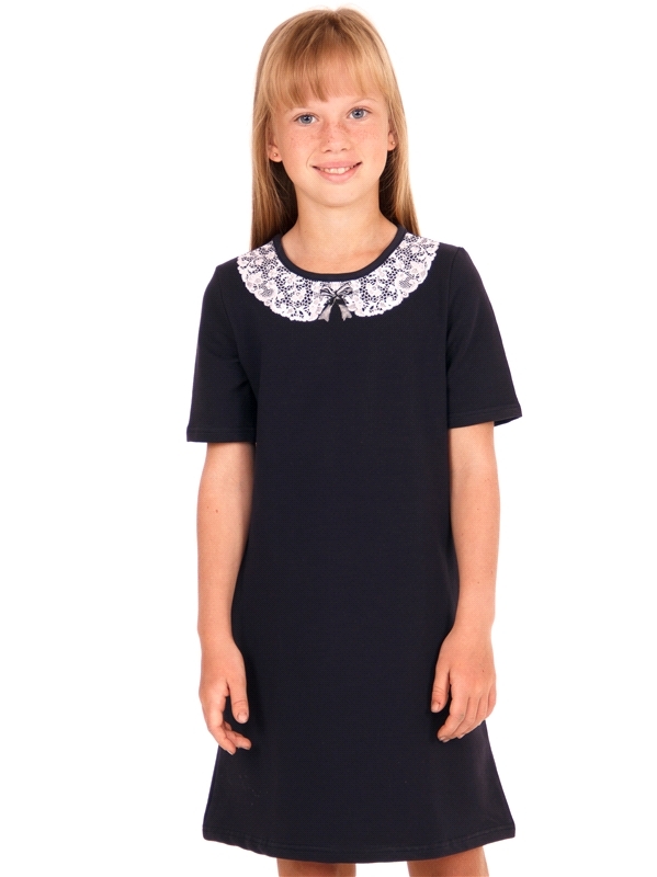 Состав: футер / хлопок 95% + лайкра 5%. Платье для девочки выполнено из теплого хлопкового полотна с лайкрой. Изделие с короткими рукавами, на кокетке, декорировано печатью, имитирующей кружево. Отлич... Показать описаниеный вариант для школы! Уход: только машинная стирка (руками не стирать!) при температуре 40 градусов, без предварительного замачивания. Изделия с печатью и декором перед стиркой необходимо вывернуть на изнаночную сторону.