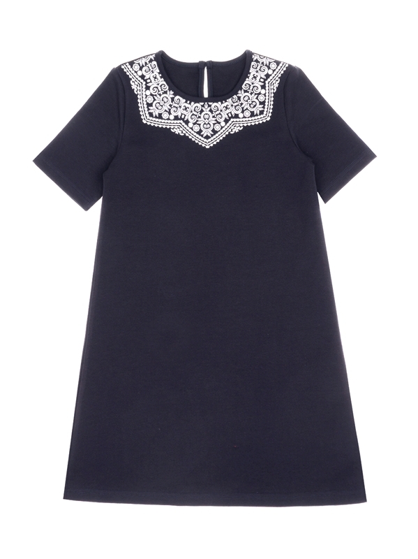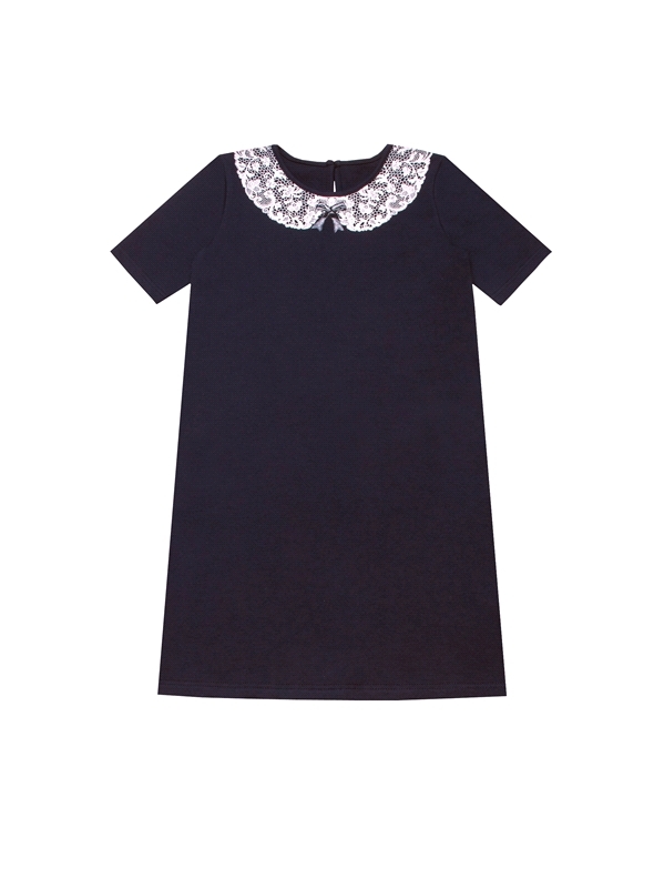Состав: футер / хлопок 95% + лайкра 5%. Платье для девочки выполнено из теплого хлопкового полотна с лайкрой. Изделие с короткими рукавами, с застежкой на пуговку по спинке, украшено печатью, имитирую... Показать описаниещей кружевной воротник. Отличный вариант для школы! Уход: только машинная стирка (руками не стирать!) при температуре 40 градусов, без предварительного замачивания. Изделия с печатью и декором перед стиркой необходимо вывернуть на изнаночную сторону.