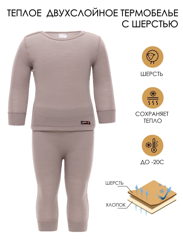Состав: интерлок / хлопок 100%, ПАН 70% + шерсть 30%. Термокомплект для малышей из лонгслива и леггинсов выполнен из двухслойного шерстяного полотна, обеспечивающего повышенную теплосберегаемость. Зас... Показать описаниетежка на кнопки по плечам. Леггинсы имеют специальный крой для удобства ношения с памперсом. Внутренний слой состоит из хлопка, легко впитывает влагу, не раздражая кожу. Внешний слой из шерсти с акрилом сохраняет тепло и помогает регулировать температуру тела. Эластичное полотно обеспечивает комфорт и свободу движений, обладает гипоаллергенными свойствами. Подходит для ежедневного использования в качестве нательного белья в холодную погоду до -20 градусов при низкой и средней физической активности. Уход: ручная стирка при температуре до 40 градусов без предварительного замачивания.