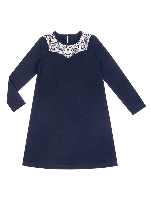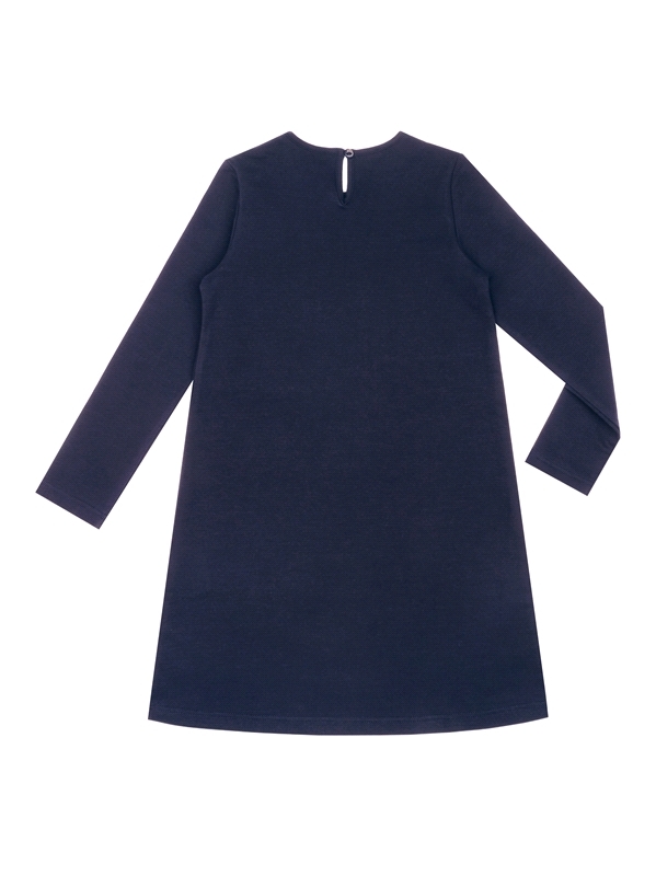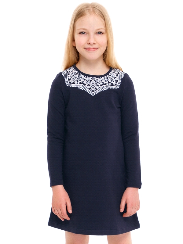 Состав: футер / хлопок 95% + лайкра 5%. Платье для девочки выполнено из эластичного хлопкового полотна. Изделие с длинными рукавами, сзади застегивается на пуговицу, украшено печатью имитирующей круже... Показать описаниево. Отличный выбор для школьницы на каждый день! Уход: только машинная стирка (руками не стирать!) при температуре 40 градусов, без предварительного замачивания. Изделия с печатью и декором перед стиркой необходимо вывернуть на изнаночную сторону.