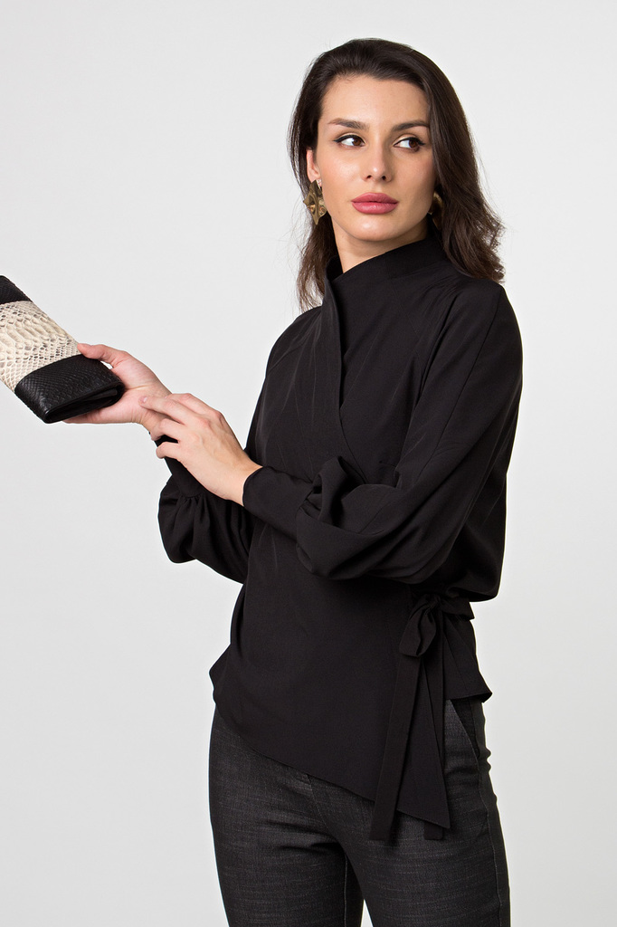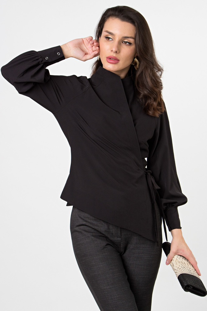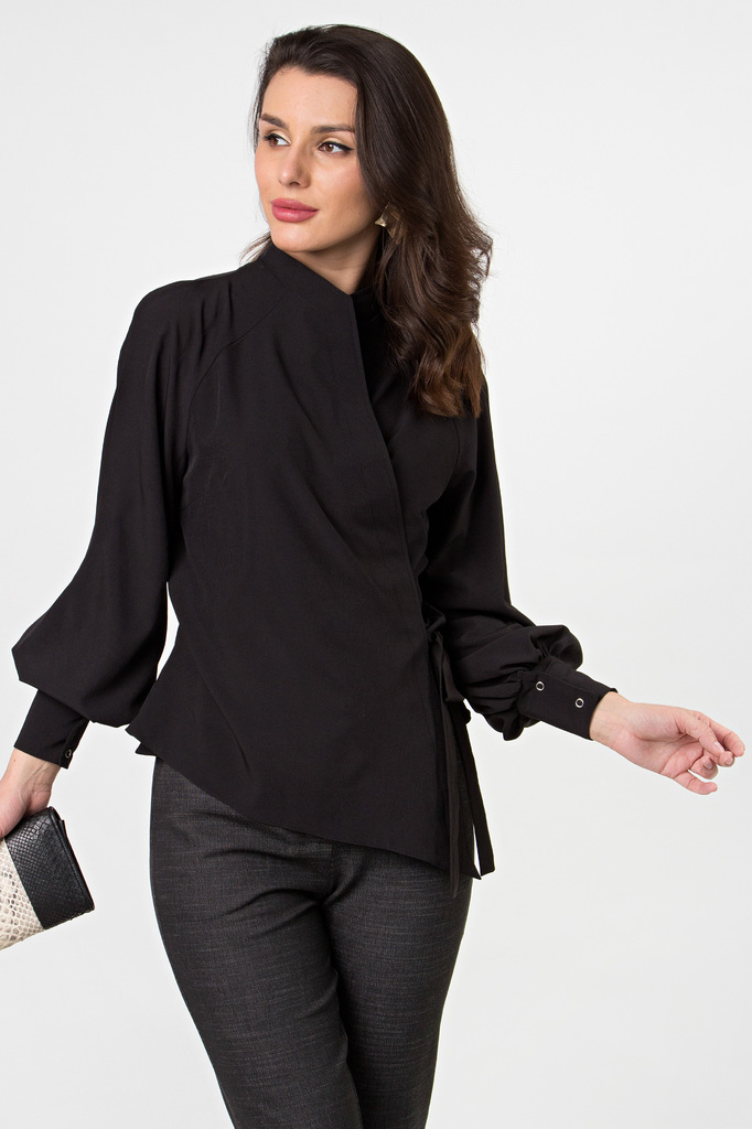 Дизайнерская блуза стала настоящим хитом продаж! Прекрасно комбинируется с брюками и джинсами! Модель выглядит очень дорого и изысканно! - Дизайнерская блуза, асимметричного кроя, на запахе; - Шикарны... Показать описанией, пышный, длинный рукав, собран внизу манжетой на кнопках; - Блуза фиксируется пояском, который продевается в прорезь по боку и завязывается на бант или узел; - Ткань: блузочная; - Состав: 97 п/э, 3 эластан; - Цвет: черный; - Размерная линейка 46-56; - Длина изделия по спинке: 44/ 57 см, 46/ 58 см, 48/ 58,5 см, 50/ 59 см, 52/ 59,5 см, 54/ 60 см, 56/ 60,5 см; - Длина рукава: 44/ 58 см, 46/ 59 см, 48/ 59,5 см, 50/ 60 см, 52/ 61 см, 54/ 62 см, 56/ 63 см; - Параметры модели: размер 44, рост 175 см; - Рекомендована ручная стирка при 30 С.