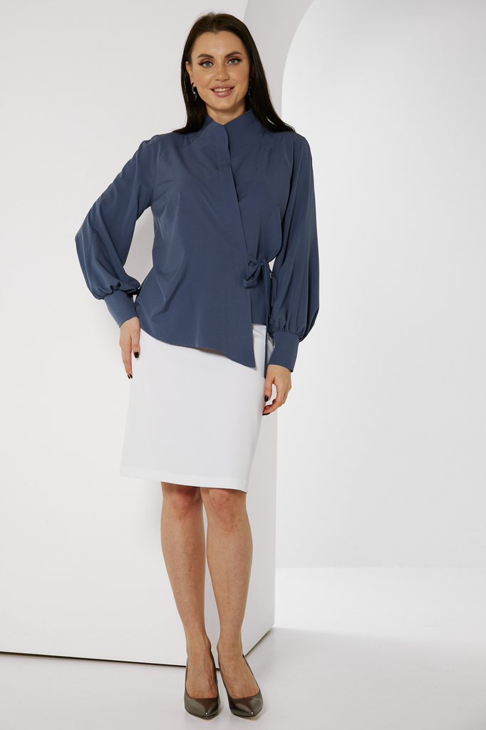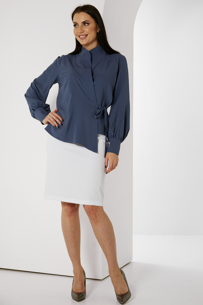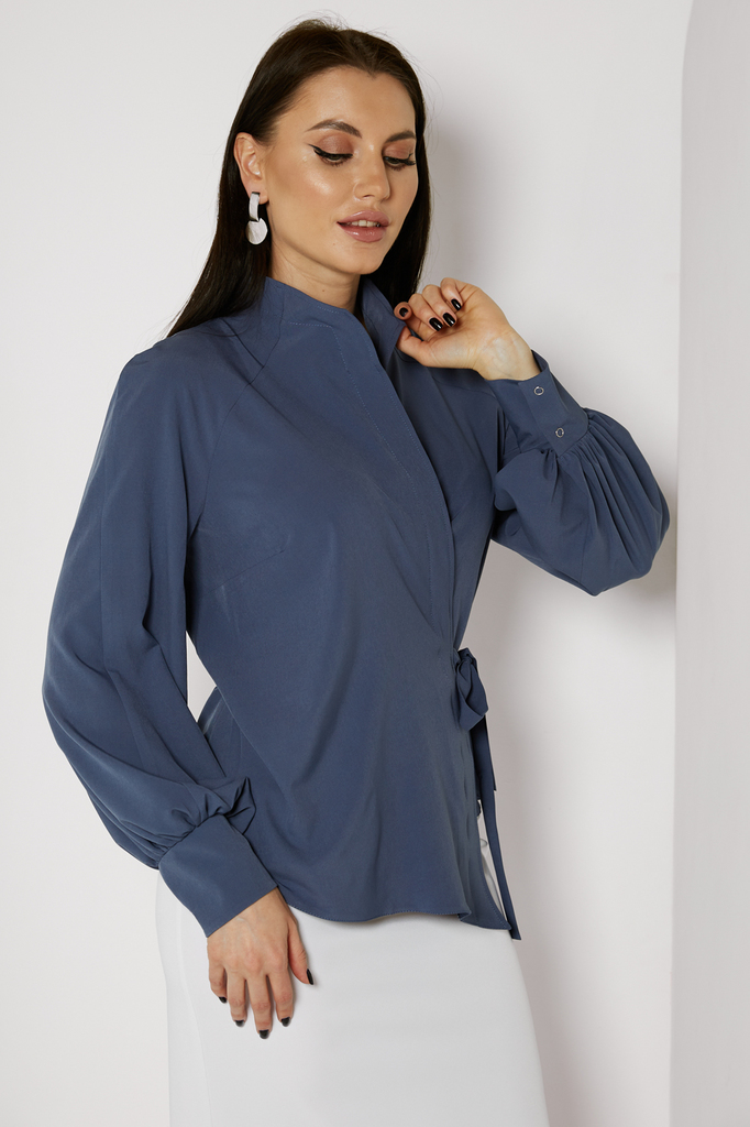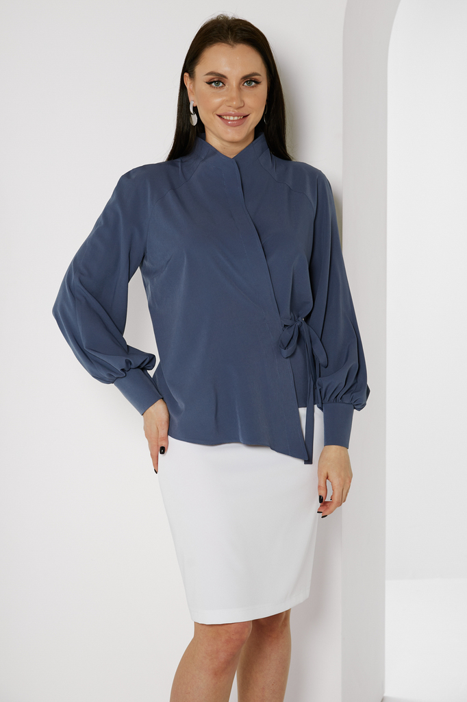 Дизайнерская блуза стала настоящим ХИТОМ ПРОДАЖ! Прекрасно комбинируется с любым низом: брюками, джинсами или леггинсами! Дизайнерская блуза, асимметричного кроя, на запахе; Шикарный, пышный, длинный ... Показать описаниерукав, собран внизу манжетой на кнопках; Блуза фиксируется пояском, который продевается в прорезь по боку и завязывается на бант или узел; Ткань: блузочная; Состав: 98 п/э, 2 эластан; Цвет: джинс; Размерная линейка 46-56; Длина изделия по спинке: 44 - 57 см, 46 - 58 см, 48 - 58,5 см, 50 - 59 см, 52 - 59,5 см, 54 - 60 см, 56 - 60,5 см; Длина рукава: 44 - 58 см, 46 - 59 см, 48 - 59,5 см, 50 - 60 см, 52 - 61 см, 54 - 62 см, 56 - 63 см; Рекомендована ручная стирка при 30 С; Параметры модели: рост 164, грудь 91 см, талия 64 см, бедра 92 см. На модели представлен 44 размер.