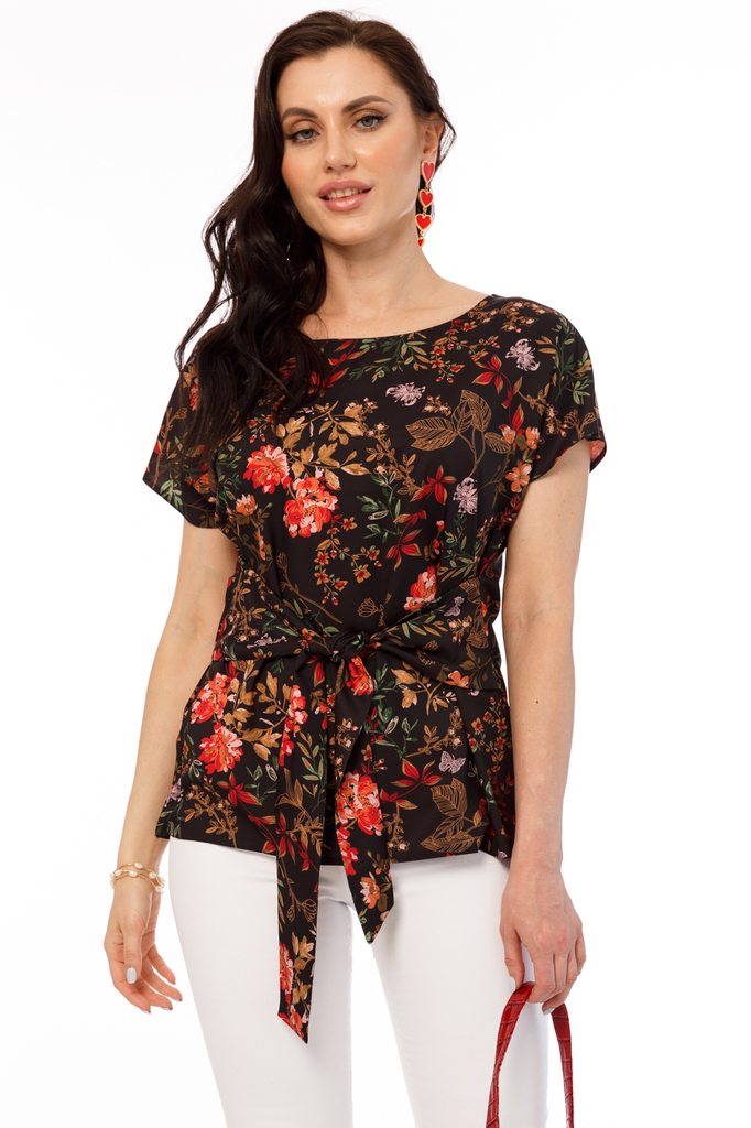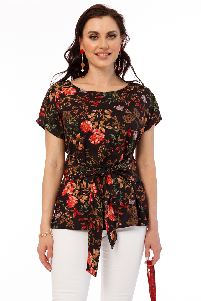 Блуза прекрасно дополнит Ваш гардероб, ведь она универсальна! Одинакова шикарно смотрится с брючками и юбками, а так же в кежуал образе с джинсами! Блуза прямого кроя, вырез горловины округлый; Издели... Показать описаниее с секретом - поясок можно завязать по переду или по спинке. Экспериментируйте и удивляйте, каждый день создавая новый образ!; Рукав цельнокроенный, короткий. Блуза без замков и подкладки; Ткань: плательная; Состав: 95% полиэстер, 5% эластан; Цвет: черный; Принт: цветы; Размерная линейка: 44-56; Длина изделия: 44 - 65 см, 46 - 66 см, 48 - 67 см, 50 - 68 см, 52 - 69 см, 54 - 70 см, 56 - 71 см; Параметры модели: рост 170 см, грудь 93 см, талия 64 см, бедра 94 см Рекомендована ручная стирка при 30 С.
