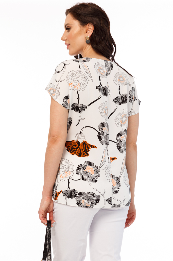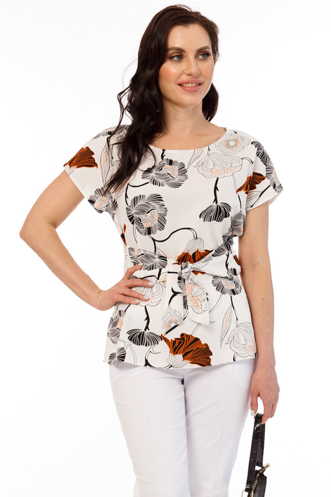 Блуза прекрасно дополнит Ваш гардероб, ведь она универсальна! Одинакова шикарно смотрится с брючками и юбками, а так же в кежуал образе с джинсами! Блуза прямого кроя, вырез горловины округлый; Издели... Показать описаниее с секретом - поясок можно завязать по переду или по спинке. Экспериментируйте и удивляйте, каждый день создавая новый образ!; Рукав цельнокроенный, короткий. Блуза без замков и подкладки; Ткань: плательная; Состав: 95% полиэстер, 5% эластан; Цвет: белый; Принт: цветы; Размерная линейка: 44-56; Длина изделия: 44 - 65 см, 46 - 66 см, 48 - 67 см, 50 - 68 см, 52 - 69 см, 54 - 70 см, 56 - 71 см; Параметры модели: рост 170 см, грудь 93 см, талия 64 см, бедра 94 см Рекомендована ручная стирка при 30 С.
