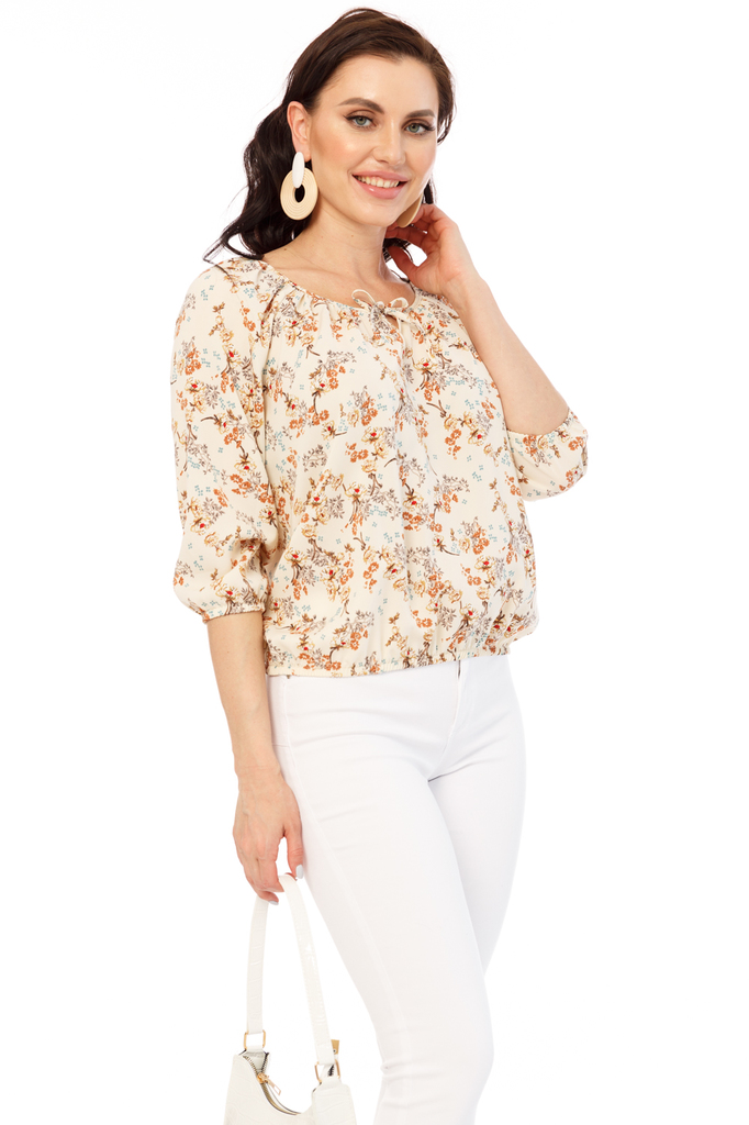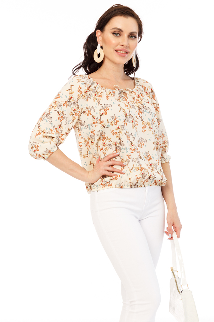 С помощью нашей новой блузы Вы сможете воплотить в реальность самые привлекательные летние образы! Универсальная вещь в гардеробе, присутствующая в гардеробе каждой женщины! Блуза прямого кроя из легк... Показать описаниеой ткани, вырез горловины округлый; Низ изделия ровный, регулируется резинкой; Рукав до локтя, на резинке формирует небольшой фонарик; По переду завязки, которые образуют вырез капельку в зоне декольте; Состав: 95% полиэстер, 5% эластан; Цвет: персиковый; Принт: цветы / веточки; Размерная линейка: 46-56; Длина изделия по спинке: 46 - 62 см, 48 - 63 см, 50 - 64 см, 52 - 66 см, 54 - 68 см, 56 - 70 см; Рекомендована ручная стирка при 30 С; Параметры модели: размер 44, рост 170 см, грудь 93 см, талия 64 см, бедра 94 см.