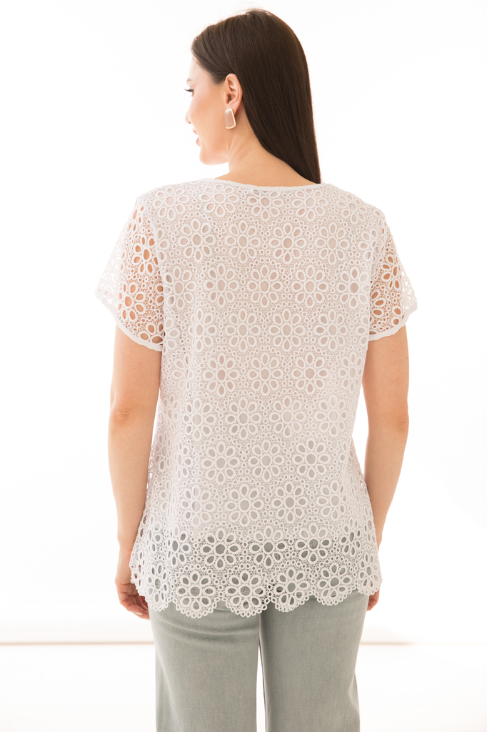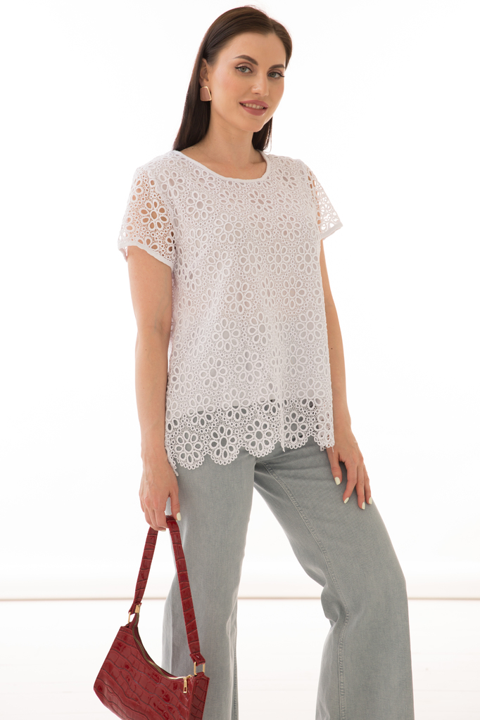 Как создать себе летнее настроение? Конечно же, новым образом! Стильная блуза прекрасно будет комбинироваться с любым низом и создаст воздушный женственный аутфит! Женственная блуза полуприлегающего с... Показать описаниеилуэта в красивый флористический принт выполнена из гипюровой ткани; Круглый вырез горловины, рукав короткий, втачной; Без замков; Состав: 63% вискоза, 34% полиэстер, 3% эластан; Цвет: белый; Принт: ромашки; Размерная линейка: 48-56; Длина изделия: 48 - 65 см, 50 - 66 см, 52 - 67 см, 54 - 68 см, 56 - 69 см; Рекомендована ручная стирка при 30 С; Параметры модели: размер 44, рост 170 см, грудь 93 см, талия 64 см, бедра 94 см.