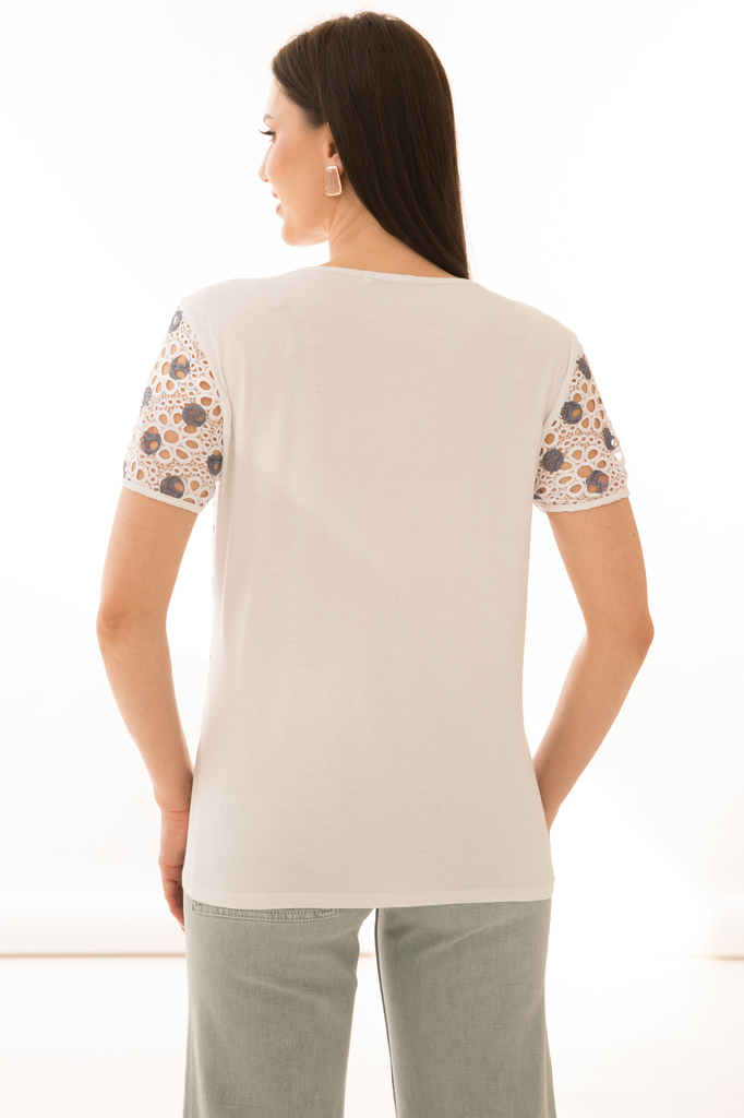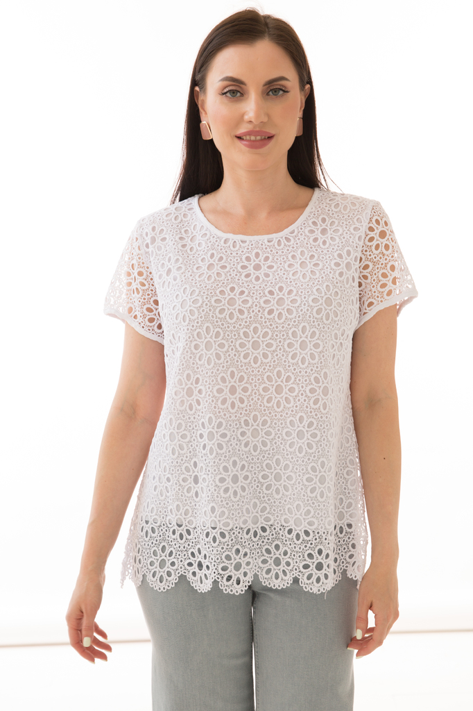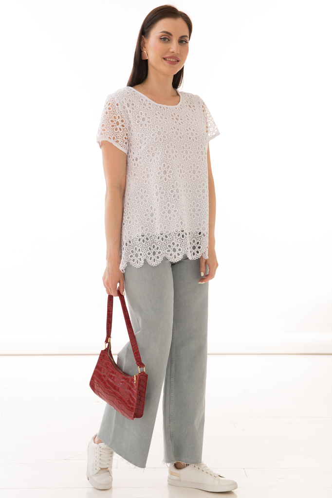 Как создать себе хорошее настроение? Конечно же, новым образом! Стильная и удобная трикотажная блуза прекрасно будет комбинироваться с любым низом Её можно надеть под жакет или кардиган. Женственная б... Показать описаниелуза прилегающего силуэта со вставками из эластичного гипюра; V-образный вырез горловины, рукав короткий, втачной, выполнен из гипюра в тон; Блуза без замков и застежек; Состав: 95% хлопок, 5% спандекс; Ткань: трикотаж (хорошо растяжим); Цвет: белый; Размерная линейка: 46-54; Длина изделия по спинке: 46 / 54 см, 48 / 55 см, 50 / 56 см, 52 / 58 см, 54 / 59 см; Допуск отклонения длины при массовом производстве 1-3 см является нормой; Рекомендована ручная стирка при 30 С; Параметры модели: рост 170 см, грудь 86 см, талия 60 см, бедра 93 см.
