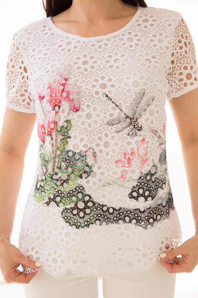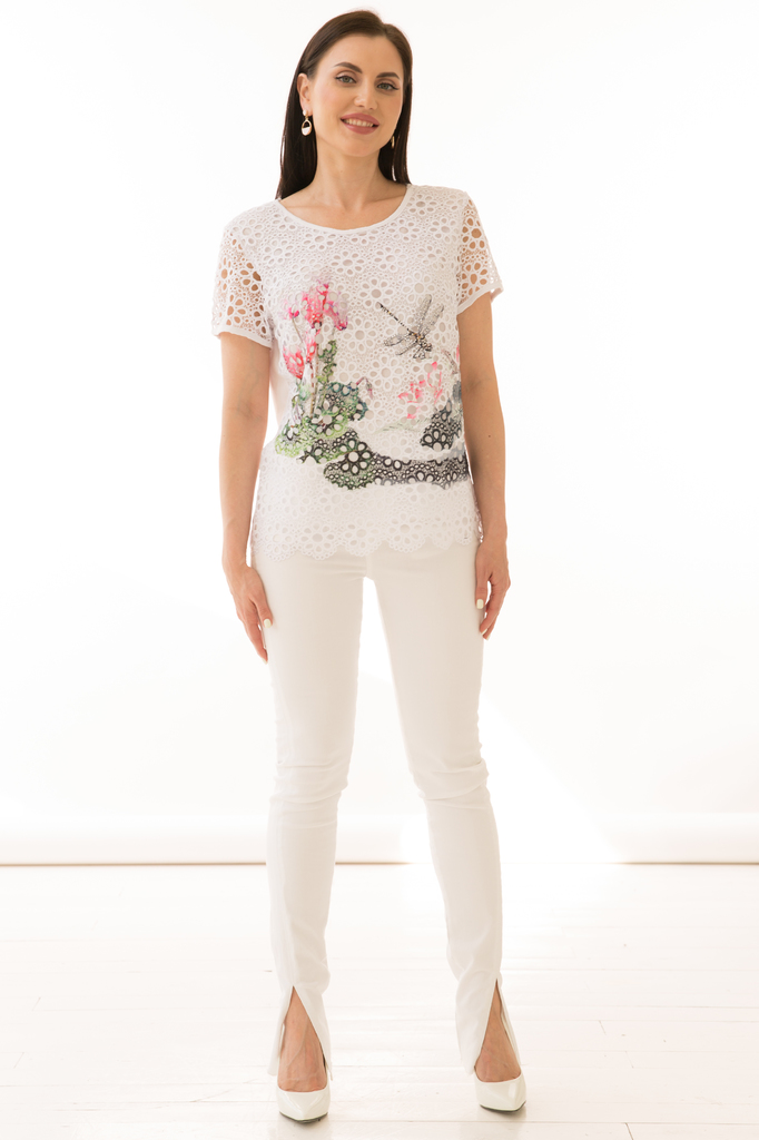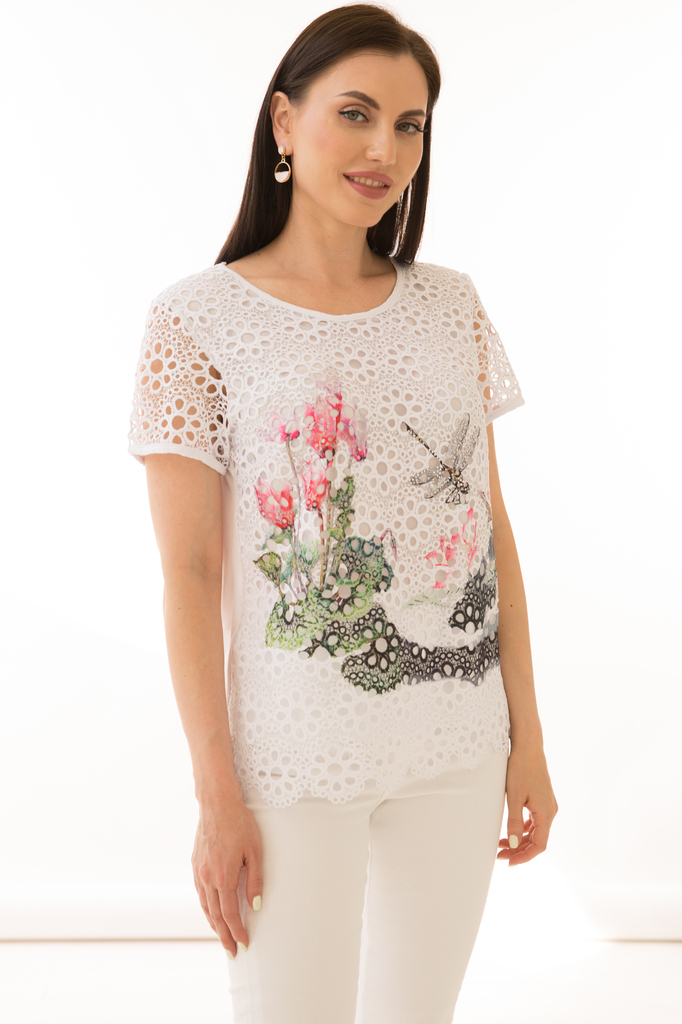 Как создать себе летнее настроение? Конечно же, новым образом! Стильная блуза прекрасно будет комбинироваться с любым низом и создаст воздушный женственный аутфит! Женственная блуза полуприлегающего с... Показать описаниеилуэта из комбинированной ткани в красивый летний принт "Стрекоза"; Круглый вырез горловины, рукав короткий, втачной выполнен из гипюровой белой ткани ; Без замков; Состав: 63% вискоза, 34% полиэстер, 3% эластан; Цвет: белый; Принт: стрекоза / цветы; Размерная линейка: 46-56; Длина изделия: 46 - 59 см, 48 - 57 см, 50 - 58 см, 52 - 58 см, 54 - 59 см, 56 - 59 см; Рекомендована ручная стирка при 30 С; Параметры модели: размер 44, рост 170 см, грудь 93 см, талия 64 см, бедра 94 см.