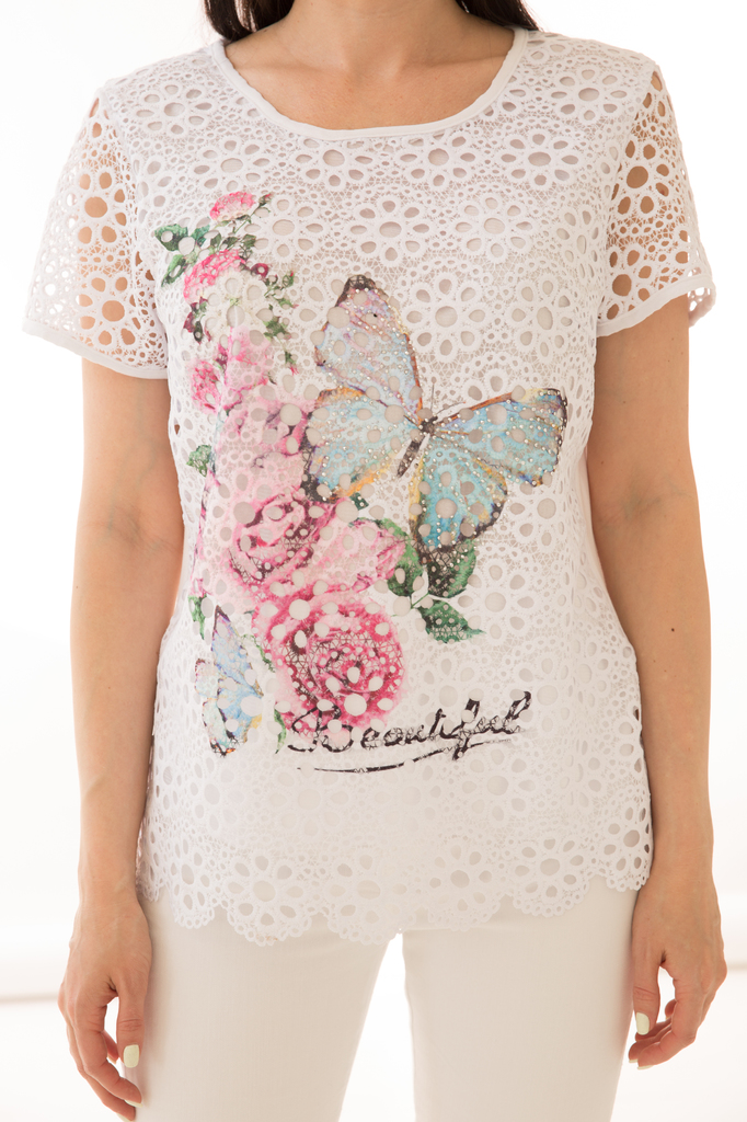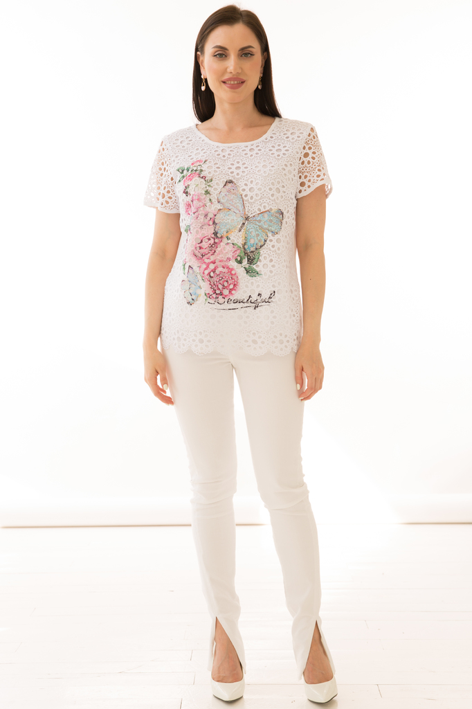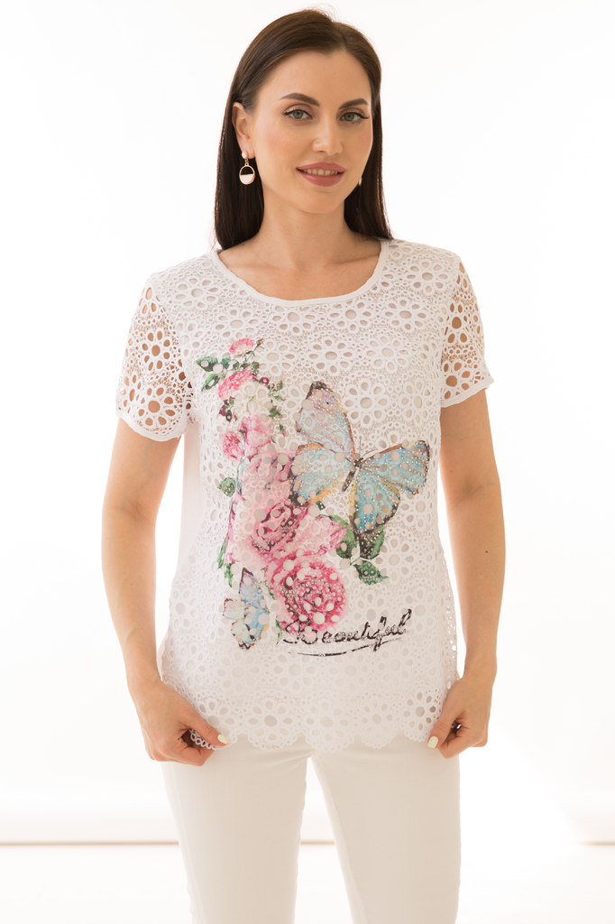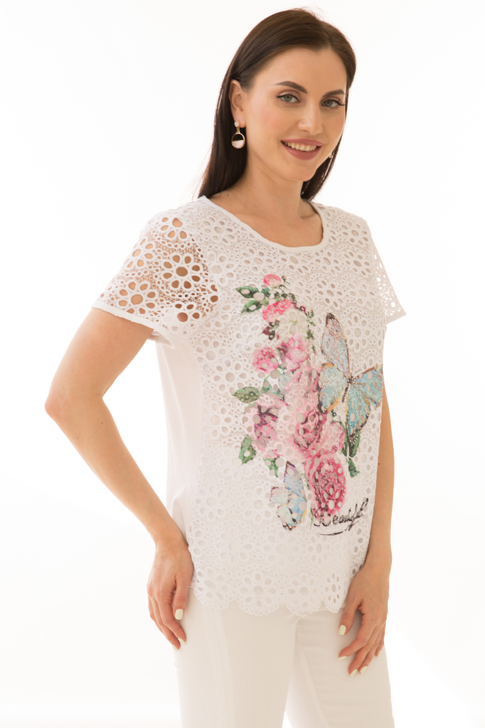 Как создать себе летнее настроение? Конечно же, новым образом! Стильная блуза прекрасно будет комбинироваться с любым низом и создаст воздушный женственный аутфит! Женственная блуза полуприлегающего с... Показать описаниеилуэта из комбинированной ткани в красивый летний принт "Бабочка"; Круглый вырез горловины, рукав короткий, втачной выполнен из гипюровой белой ткани ; Без замков; Состав: 63% вискоза, 34% полиэстер, 3% эластан; Цвет: белый; Принт: бабочка / цветы; Размерная линейка: 46-56; Длина изделия: 46 - 59 см, 48 - 57 см, 50 - 58 см, 52 - 58 см, 54 - 59 см, 56 - 59 см; Рекомендована ручная стирка при 30 С; Параметры модели: размер 44, рост 170 см, грудь 93 см, талия 64 см, бедра 94 см.