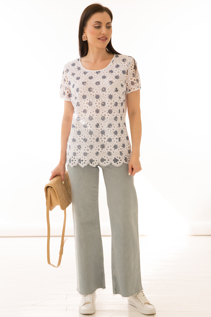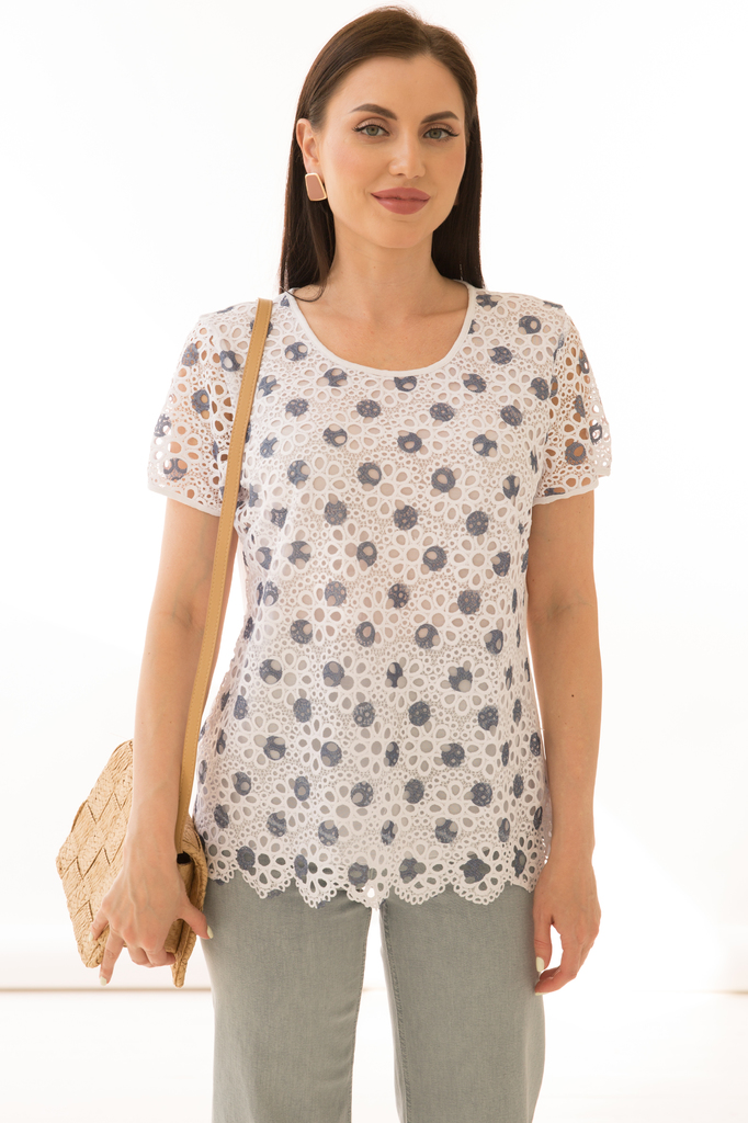 Как создать себе летнее настроение? Конечно же, новым образом! Стильная блуза прекрасно будет комбинироваться с любым низом и создаст воздушный женственный аутфит! Женственная блуза полуприлегающего с... Показать описаниеилуэта из комбинированной ткани в красивый геометрический принт; Круглый вырез горловины, рукав короткий, втачной выполнен из гипюровой белой ткани ; Без замков; Состав: 63% вискоза, 34% полиэстер, 3% эластан; Цвет: белый; Принт: геометрия / голубые круги; Размерная линейка: 46-56; Длина изделия: 46 - 59 см, 48 - 57 см, 50 - 58 см, 52 - 58 см, 54 - 59 см, 56 - 59 см; Рекомендована ручная стирка при 30 С; Параметры модели: размер 44, рост 170 см, грудь 93 см, талия 64 см, бедра 94 см.
