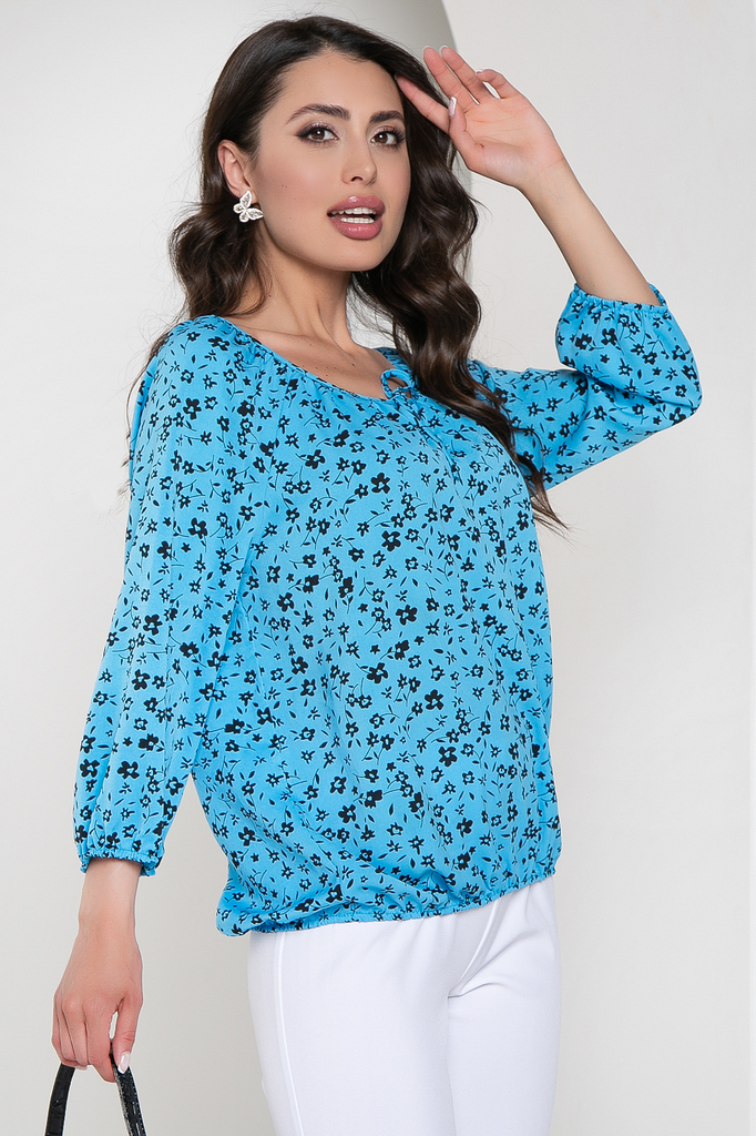 С помощью нашей новой блузы Вы сможете воплотить в реальность самые привлекательные образы! Универсальная вещь в гардеробе, присутствующая в гардеробе каждой женщины! Блуза прямого кроя из легкой тка... Показать описаниени, вырез горловины округлый; Низ изделия ровный, регулируется резинкой; Рукав до локтя, на резинке формирует небольшой фонарик; По переду завязки, которые образуют вырез капельку в зоне декольте; Состав: 95% полиэстер, 5% эластан; Цвет: васильковый; Принт: мелкие цветы; Размерная линейка: 46-56; Длина изделия по спинке: 46 - 62 см, 48 - 63 см, 50 - 64 см, 52 - 66 см, 54 - 68 см, 56 - 70 см; Рекомендована ручная стирка при 30 С; Параметры модели: рост 170 см, грудь 86 см, талия 60 см, бедра 93 см.