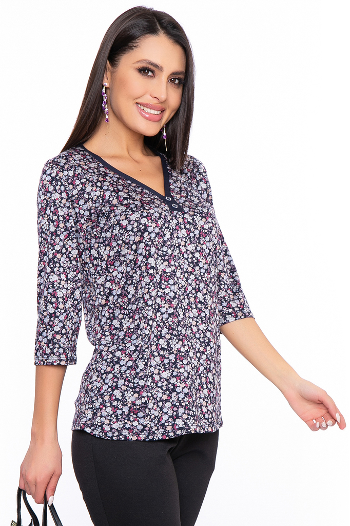 Яркая блуза с цветочным принтом идеально подойдет на каждый день и будет отлично сочетаться, как с джинсами, так и с юбкой или брюками. Блуза полуприталенного силуэта; V-образный вырез горловины с кон... Показать описаниетрастной обтачкой, украшен двумя декоративными пуговицами; Рукав цельнокроеный, три четверти; Ткань: трикотаж (хорошо растяжим); Состав: 95% полиэстер, 5% эластан; Цвет: синий; Принт: полевые цветы; Размерная линейка: 46-54; Длина изделия: 46 / 60 см, 48 / 60 см, 50 / 63 см, 52 / 63 см, 54 / 63 см; Допуск отклонения длины при массовом производстве 1-3 см является нормой; Параметры представленные в размерной таблице относятся к объемам фигуры, если Вам необходимы конкретные замеры готового изделия обратитесь к менеджеру; Рекомендована ручная стирка при 30 С; Параметры модели: рост 170 см, грудь 86 см, талия 60 см, бедра 93 см.