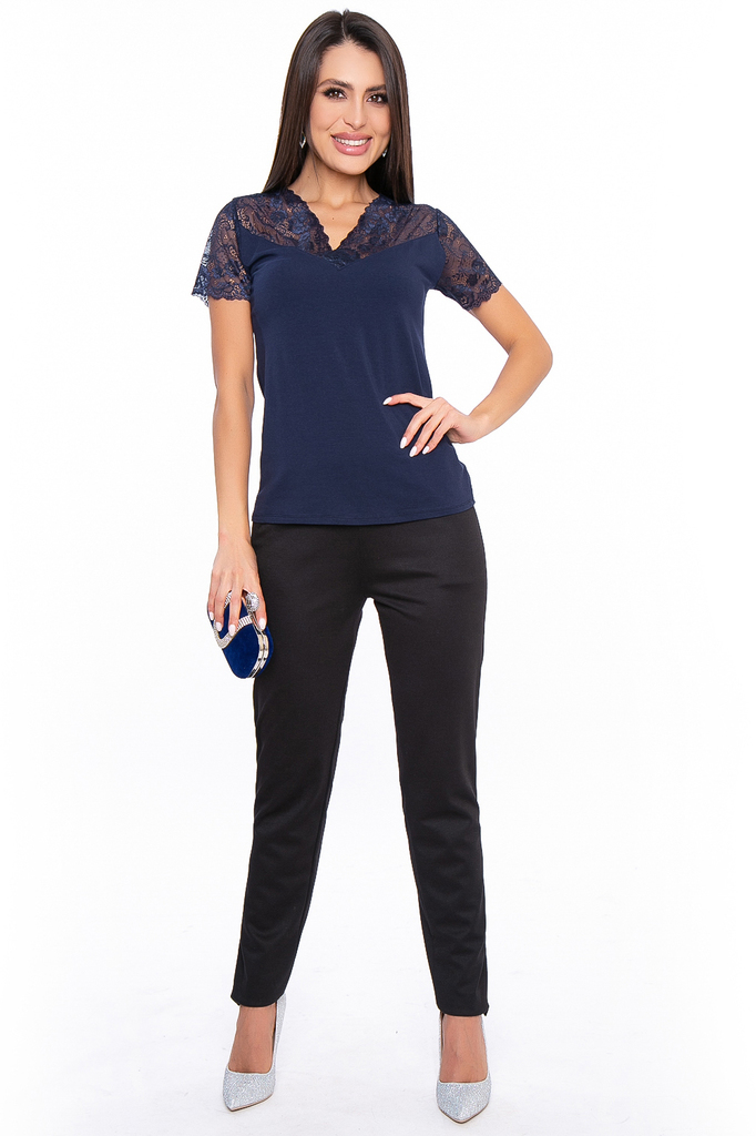 Как создать себе хорошее настроение? Конечно же, новым образом! Стильная и удобная трикотажная блуза прекрасно будет комбинироваться с любым низом. Её можно надеть под жакет или кардиган. Женственная ... Показать описаниеблуза прилегающего силуэта со вставками из эластичного гипюра; V-образный вырез горловины, рукав короткий, втачной, выполнен из гипюра в тон; Блуза без замков и застежек; Состав: 95% хлопок, 5% спандекс; Ткань: трикотаж (хорошо растяжим); Цвет: синий; Размерная линейка: 46-54; Длина изделия по спинке: 46 / 56 см, 48 / 56 см, 50 / 57 см, 52 / 58 см, 54 / 59 см; Допуск отклонения длины при массовом производстве 1-3 см является нормой; Рекомендована ручная стирка при 30 С; Параметры модели: рост 170 см, грудь 86 см, талия 60 см, бедра 93 см.
