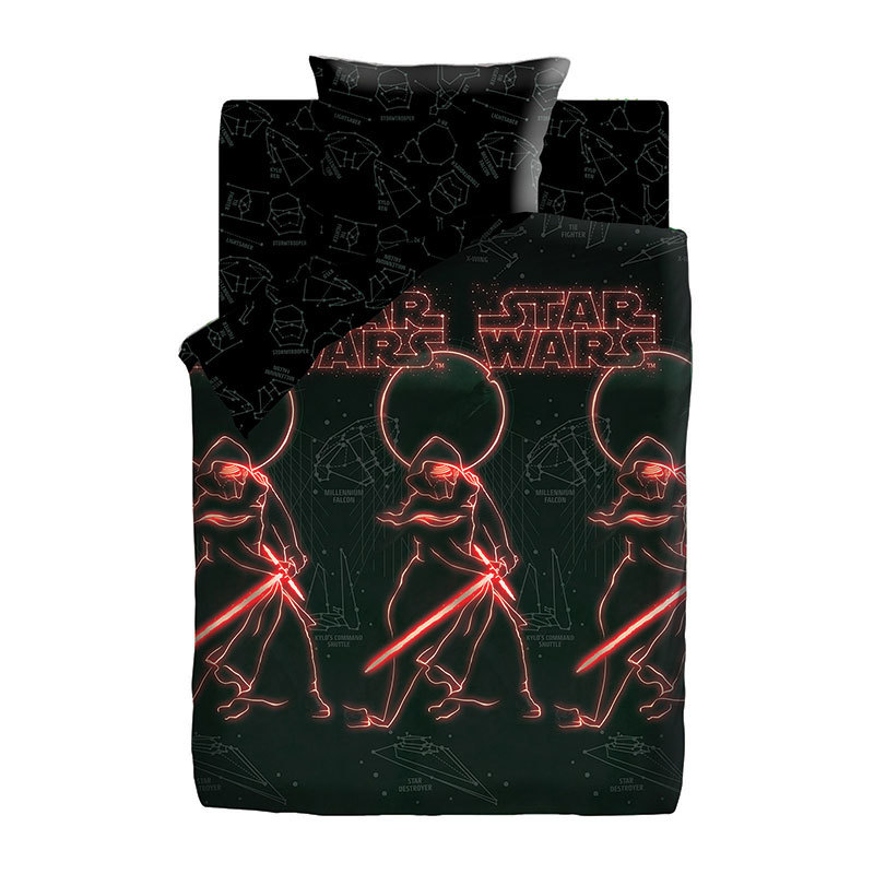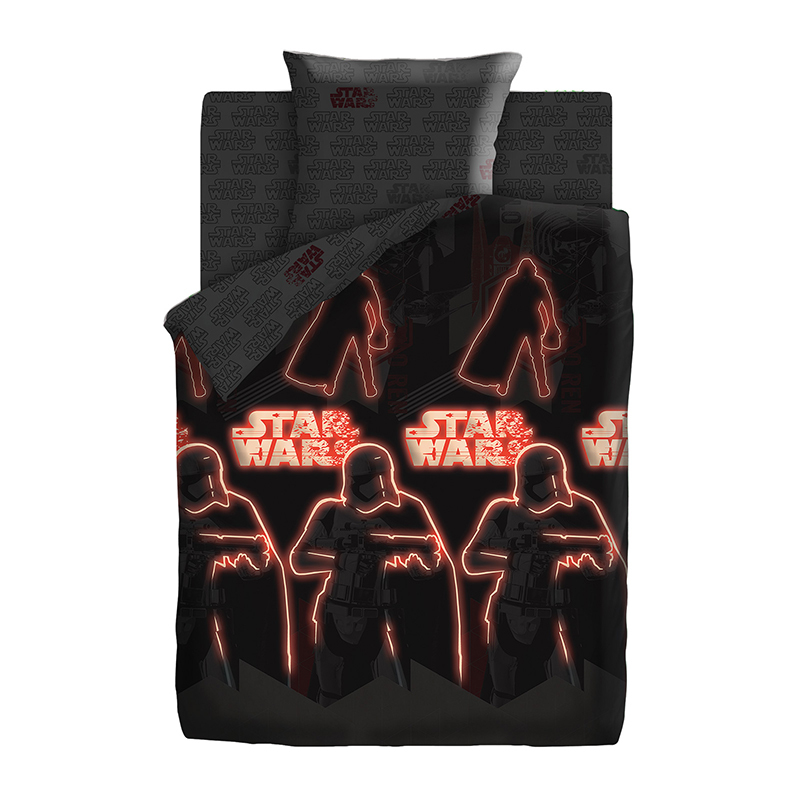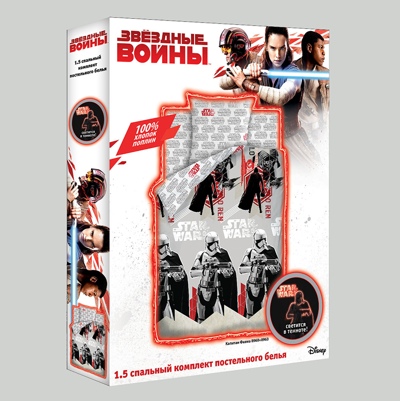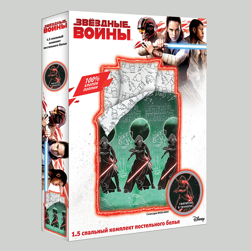 Тип ткани: Поплин, 100% хлопок; Тематика: Звездные войны; Назначение: Для детей; Коллекция: ЛИЦЕНЗИЯ; Плотность ткани: 125 гр/м2; Производитель: ЭКОЛАНИнформация о товареТкань светится в темноте. Сост... Показать описаниеав и размеры комплекта постельного белья для детей:Размер (1,5сп.)Пододеяльник 150х215см – 1 шт.Простыня 150х214см – 1 шт.Наволочки 70х70см или 50х70см – 1 шт.Размер (ясли)Пододеяльник 147х112см - 1 шт.Простыня 147х100см - 1 шт.Наволочка 40х60см - 1 шт.ОБРАТИТЕ ВНИМАНИЕ!Изображение постельного белья, размещенное на сайте, не дает точного представления о том, как расположен рисунок на отдельных предметах постельного белья. В случае если комплект белья состоит из основной расцветки и компаньона, то наволочки и простыни отшиваются из компаньона, а пододеяльник целиком из основной расцветки. Рисунок на наволочках не обязательно будет таким, как на картинке, т.к. при раскрое на наволочки попадают разные фрагменты ткани, за исключением купонных тканей, где идет специальное изображение на наволочки.