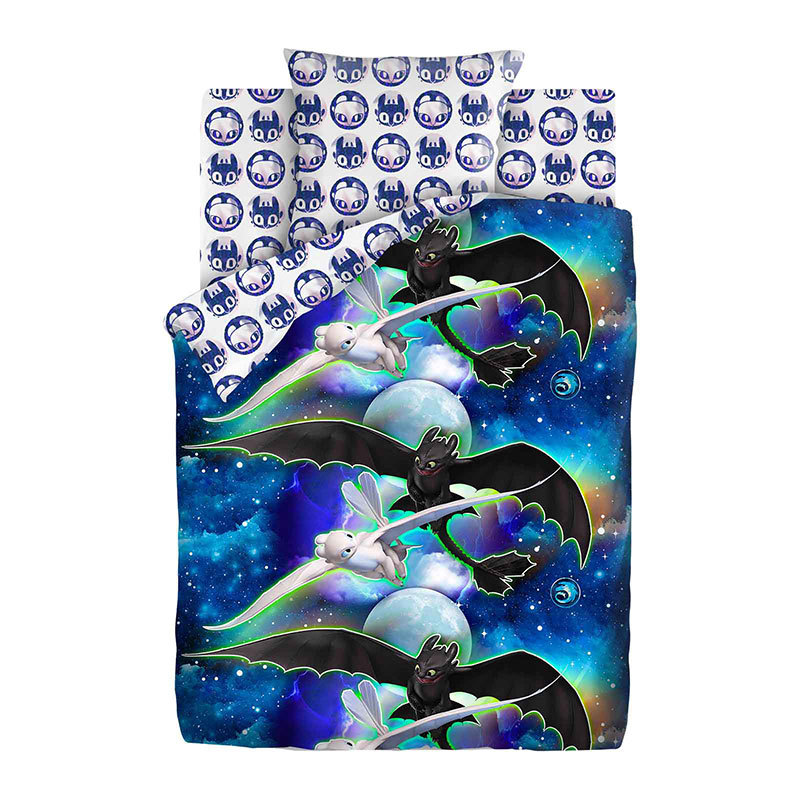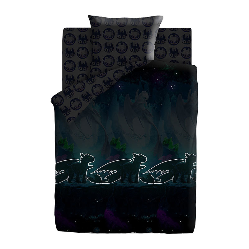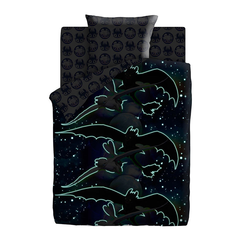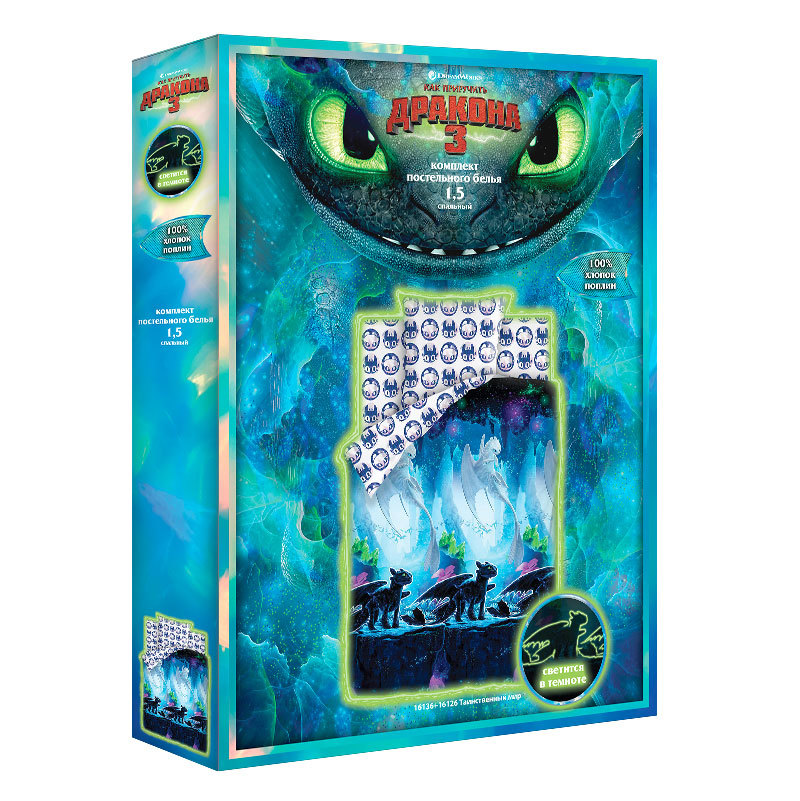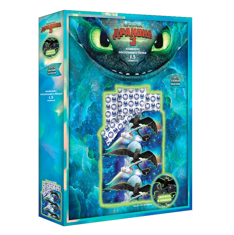 Тип ткани: Поплин, 100% хлопок; Тематика: Как приручить дракона; Назначение: Для детей; Коллекция: ЛИЦЕНЗИЯ; Плотность ткани: 125 гр/м2; Производитель: ЭКОЛАНИнформация о товареТкань светится в темнот... Показать описаниее. Состав и размеры комплекта постельного белья для детей:Размер (1,5сп.)Пододеяльник 150х215см – 1 шт.Простыня 150х214см – 1 шт.Наволочки 70х70см или 50х70см – 1 шт.Размер (ясли)Пододеяльник 147х112см - 1 шт.Простыня 147х100см - 1 шт.Наволочка 40х60см - 1 шт.ОБРАТИТЕ ВНИМАНИЕ!Изображение постельного белья, размещенное на сайте, не дает точного представления о том, как расположен рисунок на отдельных предметах постельного белья. В случае если комплект белья состоит из основной расцветки и компаньона, то наволочки и простыни отшиваются из компаньона, а пододеяльник целиком из основной расцветки. Рисунок на наволочках не обязательно будет таким, как на картинке, т.к. при раскрое на наволочки попадают разные фрагменты ткани, за исключением купонных тканей, где идет специальное изображение на наволочки.