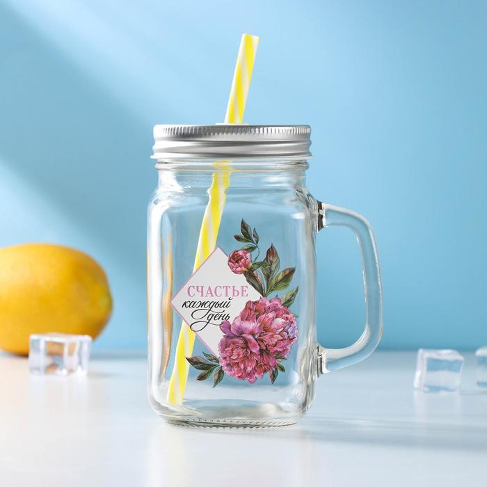 Банка с ручкой, крышкой и трубочкой Доляна «Счастье», 450 мл, 10?7,5?13 см Вопросы по товару