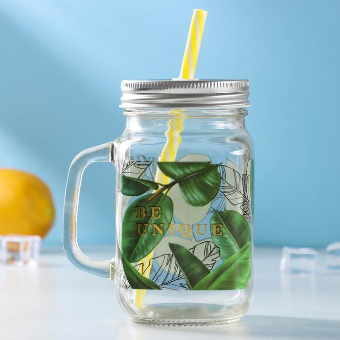 Банка с ручкой, крышкой и трубочкой Доляна «Растения», 450 мл, 10?7,5?13 см