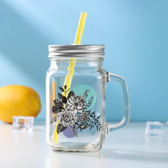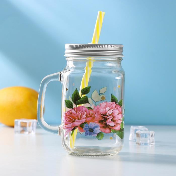 Банка с ручкой, крышкой и трубочкой Доляна «Цветочный букет», 450 мл, 10?7,5?13 см