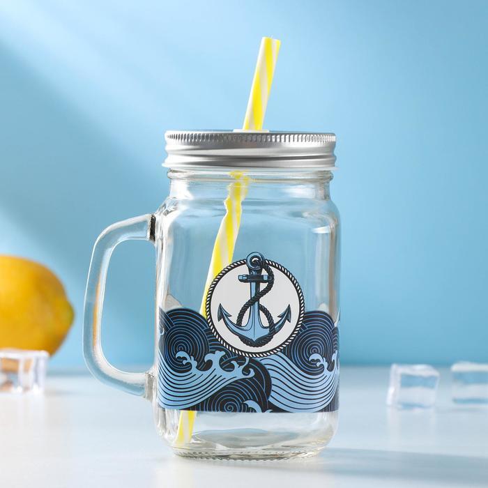 Банка с ручкой, крышкой и трубочкой Доляна «Якорь», 450 мл, 10?7,5?13 см