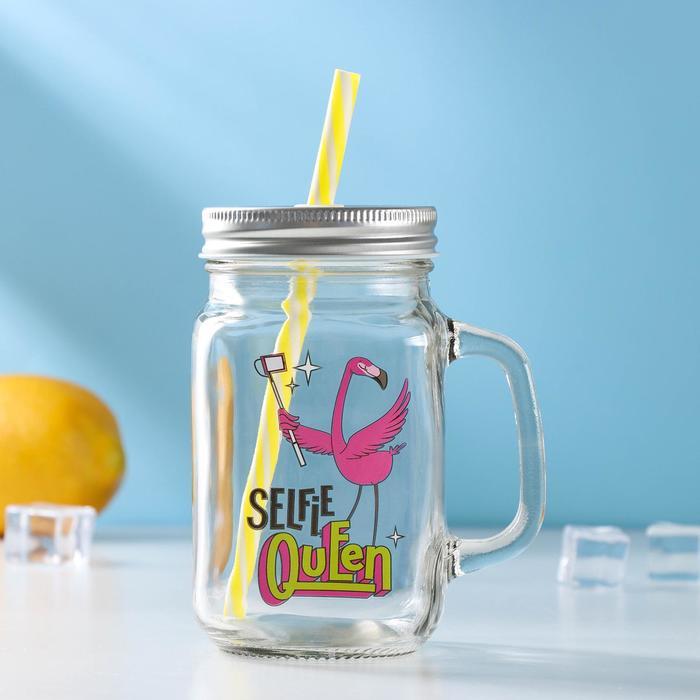 Банка с ручкой, крышкой и трубочкой Доляна «Королева фламинго», 450 мл, 10?7,5?13 см