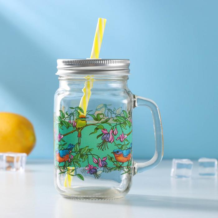 Банка с ручкой, крышкой и трубочкой Доляна «Пташки», 450 мл, 10?7,5?13 см