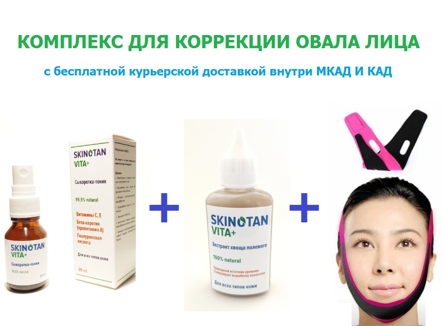 Комплекс для коррекции овала лица состоит их 3-х элементов: 1. Сыворотка-тоник "SKINOTAN VITA+" 20мл. 2. Экстракт хвоща "SKINOTAN VITA+" 50мл. 3. Корректирующая 3D ЛИФТИНГ ПОВЯЗКА-БАНДАЖ. Сыворотка-то... Показать описаниеник "SKINOTAN VITA+": Моментально тонизирует, увлажняет и подтягивает кожу. Выравнивает цвет, придает ей здоровый и сияющий вид. Насыщает кожу витаминами. Поддерживает упругость и эластичность. Защищает от УФ-лучей. Активизирует процессы заживления и обновления кожных покровов. Блокирует свободные радикалы и создает мощный антивозрастной барьер. Состав: Подготовленная вода, соевый лецитин, низкомолекулярная гиалуроновая кислота, масло мускатного шалфея, инкапсулированный в липосомы стабилизированный витамин С, витамин Е, бета-каротин (провитамин А), хинозол. Натуральность: 99,5% ВАЖНО! Сыворотка-тоник усиливает действие других косметических средств (кремов, масок и др.), если наносить их через 1 – 2 минуты после ее применения. Экстракт хвоща "SKINOTAN VITA+": Стимулирует выработку собственного коллагена. При курсовом применении оказывает выраженное подтягивающее действие. Помогает снять отеки, уменьшить «мешки» и «синяки» под глазами. Предотвращает ломкость ногтевых пластин, укрепляет, питает и ускоряет их рост. Выравнивает подкожный рельеф. Заметно уменьшает послеродовые растяжки. Состав: 100 % экстракт хвоща полевого, ксантановая камедь. Натуральность: 100%. Корректирующая 3D ЛИФТИНГ ПОВЯЗКА-БАНДАЖ: Изменяет и корректирует овал лица. Убирает двойной подбородок. Формирует красивые скулы и щеки, предотвращая их обвисание. Используется после продолжительных диет и пластических операций. Состав: высококачественный нейлон 85%, неопрен 15% Все 3 элемента дополняют и усиливают действие друг друга. Применение: 1. Очистить лицо и шею. 2. С помощью распылителя нанести сыворотку-тоник на лицо, шею и подбородок. 3. Через 2-3 минуты повторно нанести сыворотку-тоник. 4. Через 1 минуту нанести экстракт хвоща и втереть его в кожу легкими массажными движениями. 5. После полного впитывания (3-5 минут) надеть повязку-бандаж. 6. Через 40-60 минут снять повязку, ополоснуть ее теплой водой и повесить сушиться (только НЕ НА НАГРЕВАТЕЛЬНЫЕ ПРИБОРЫ!). 7. Если после этого следует сон, то на лицо можно нанести питательный крем, смывать необязательно. Противопоказания: индивидуальная непереносимость. Процедуру проводить 3-4 раза в неделю минимум 1-2 месяца. Далее - по необходимости. Сразу рекомендуем заказать дополнительный набор средств-активаторов: СЫВОРОТКА-ТОНИК + ЭКСТРАКТ ХВОЩА ПОЛЕВОГО SKINOTAN VITA+ НЕ ЯВЛЯЕТСЯ ЛЕКАРСТВЕННЫМ СРЕДСТВОМ. ПЕРЕД ПРИМЕНЕНИЕМ РЕКОМЕНДУЕТСЯ ПРОКОНСУЛЬТИРОВАТЬСЯ СО СПЕЦИАЛИСТОМ.