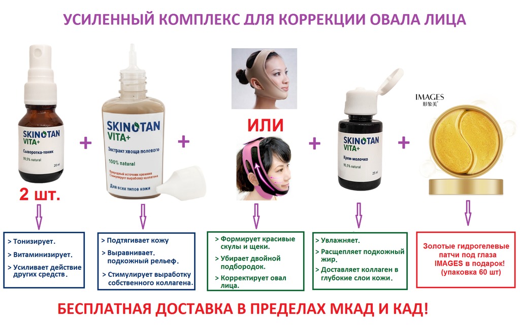 Усиленный комплекс для коррекции овала лица состоит из 4-х элементов, каждый из которых выполняет свою уникальную функцию. Вместе они усиливают, дополняют и пролонгируют действие друг друга, что в кон... Показать описаниеечном итоге выражается в более заметных результатах их применения. 1. Сыворотка-тоник "SKINOTAN VITA+" (2шт по 20мл) тонизирует, питает витаминами и подготавливает кожу для принятия других средств. Также она усиливает действие любых косметических средств, которые наносятся сразу после ее применения. Состав: подготовленная вода, соевый лецитин, низкомолекулярная гиалуроновая кислота, масло мускатного шалфея, инкапсулированный в липосомы стабилизированный витамин С, витамин Е, бета-каротин (провитамин А), хинозол. Натуральность состава: 99,5%. Подробное описание товара здесь. 2. Крем-молочко "SKINOTAN VITA+" (25мл) увлажняет и снабжает кожу двумя видами коллагена, а также биодоступным кератином. Находящийся в его составе экстракт фукуса способствует расщеплению подкожного жира. Состав: вода подготовленная, оливковое масло нерафинированное первого холодного отжима, экстракт фукуса пузырчатого, стеариновая кислота, эмульсионный воск, высокоочищенные белки коллаген и кератин в биодоступной форме, низко- и высокомолекулярная гиалуроновая кислота, масло мускатного шалфея, витамин Е, хинозол. Натуральность состава: 95,5%. Подробное описание товара здесь. Эти два средства создают активный уходовый комплекс, продлевающий молодость и естественную красоту кожи лица, шеи, подбородка, зоны декольте, рук и всего остального тела. Подробное описание комплекса находится здесь. 3. Экстракт хвоща полевого "SKINOTAN VITA+" (50 мл) стимулирует выработку собственного коллагена и выравнивает подкожный рельеф. В хвоще полевом находится большое количество кремния, благодаря чему при курсовом применении данное средство оказывает выраженное подтягивающее действие. Состав: 100 % экстракт хвоща полевого, ксантановая камедь. Натуральность: 100%. Подробное описание товара здесь. 4. Повязка-бандаж для коррекции овала лица: Изменяет и корректирует овал лица. Убирает двойной подбородок. Формирует красивые скулы и щеки, предотвращая их обвисание. Используется после продолжительных диет и пластических операций. Может использоваться в качестве фиксирующей повязки для челюсти. У нас на выбор 2 вида бандажей-повязок: черно-лиловые и бежевые. Вы можете выбрать любой из них. Применение комплекса. 1. Очистить лицо и шею. 2. С помощью распылителя нанести сыворотку-тоник на лицо, шею и подбородок. 3. Через 2-3 минуты повторно нанести сыворотку-тоник. 4. Через 1 минуту нанести экстракт хвоща и втереть его в кожу легкими массажными движениями. 5. После полного впитывания (3-5 минут) надеть повязку-бандаж. 6. Через 40-60 минут снять повязку и умыться. ЛИЦО НЕ ВЫТИРАТЬ! 7. Через 1-2 минуты на ВЛАЖНОЕ лицо нанести крем-молочко. Не втирать, дать впитаться в течение 2-4 минут, остатки равномерно распределить по коже. Процедуру проводить 3-4 раза в неделю минимум 1-2 месяца. Далее - по необходимости. После каждого применения рекомендуется ополаскивать повязку-бандаж теплой водой, можно с применением обычного мыла. Важная информация: 1. Сушить повязку следует естественным образом, не прибегая к помощи нагревательных приборов. 2. При отрицательных температурах нежелательно длительное нахождение на открытом
