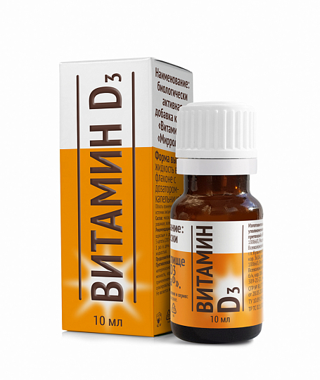 Иммуностимуляция. Укрепление функций организма. Всем известно, что витамин D3 вырабатывается под воздействием солнечного света, поэтому жители северных стран, как правило, испытывают его дефицит. Приё... Показать описанием витамина D3 не только снижает риск появления различных заболеваний, но и улучшает общее состояние организма, замедляя процесс старения. Витамин D3 необходимо применять при беременности, поскольку его нехватка способна нанести вред эмбриону, особенно его иммунной системе и мозгу, и помешать нормальному течению беременности. У людей, много употребляющих чай или кофе, потребность в витамине D3 увеличивается. Приём витамина D3 в совокупности с другими витаминами усиливает иммунную систему и является хорошим профилактическим средством против простудных заболеваний. Дополнительный источник витамина D3. Форма выпуска: капли для приема внутрь в виде бесцветной, прозрачной или слегка опалесцирующей жидкости с анисовым запахом в стеклянном флаконе 10 мл с пробкой – капельницей, в коробке картонной, 500 МЕ/капля. Продолжительность приема: 3 месяца. При необходимости курс можно продлить или повторить. Перед применением необходимо проконсультироваться с врачом. Возможный повторные приемы в течение года. Противопоказания: повышенная чувствительность к компонентам препарата, гипервитаминоз D, повышенная концентрация кальция в крови (гиперкальциемия), повышенное выделение кальция с мочой (гиперкальциурия), мочекаменная болезнь (образование кальциевых оксалатных камней), саркоидоз, острые и хронические заболевания печени и почек, почечная недостаточность, активная форма туберкулеза легких. С осторожностью: состояние иммобилизации, при приеме тиазидов, сердечных гликозидов (особенно гликозидов наперстянки). Срок годности: 3 года. СОСТАВ: холекальциферол (витамин D3), макрогола глицерилрицинолеат, сахароза, натрия гидрофосфата додекагидрат, лимонной кислоты моногидрат, ароматизатор анисовый, бензиловый спирт, вода очищенная. СПОСОБ ПРИМЕНЕНИЯ: с целью профилактики дефицита витамина D3, применять во время еды: 500МЕ (одна капля) в день. Не является лекарством.