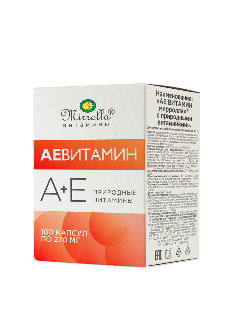 АЕ ВИТамин с природными витаминами «Мирролла» — комплекс, рекомендованный в качестве дополнительного источника витаминов А и Е. Форма выпуска: капсулы массой 270 мг. Продолжительность приема: 4-6 неде... Показать описаниель. При необходимости прием можно повторить. Возможны повторные приемы в течение года. Пищевая ценность на 100г: белки - 20 г, жиры - 37,4 г, витамин Е - 31,5 г, витамин А - 1,1 г. Энергетическая ценность на 100г: 415 кКал/1720 кДж. В суточной дозировке содержится: Витамина Е - 4 мг – 40 % от рекомендуемого суточного уровня потребления, Витамина А - 0,15 мг – 18,7 % от рекомендуемого суточного уровня потребления. Противопоказания: индивидуальная непереносимость компонентов, беременность, кормление грудью. Перед применением рекомендуется проконсультироваться с врачом. Срок годности: 2 года. Не является лекарством. Состав Масло растительное нерафинированное, альфа-токоферола ацетат, ретинола пальмитат, оболочка капсулы: желатин пищевой, влагоудерживающий агент - глицерин, антиокислитель - лимонная кислота, вода. Способ применения Взрослым и детям старше 14 лет по 1 капсуле 1 раз в день во время еды.