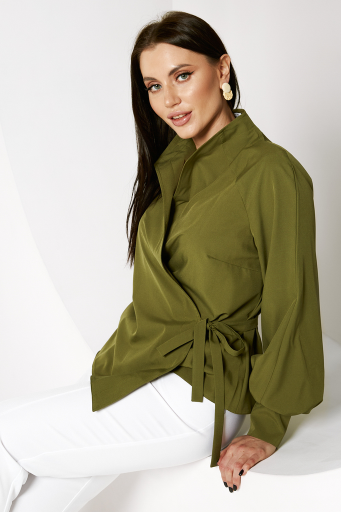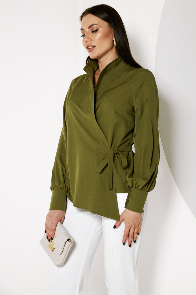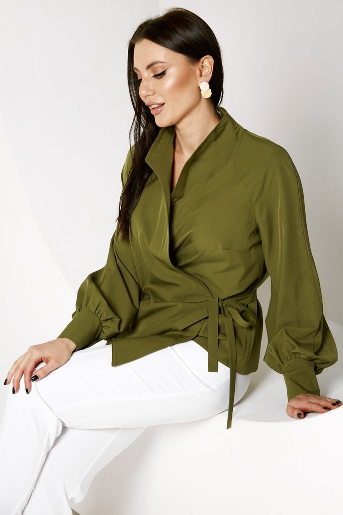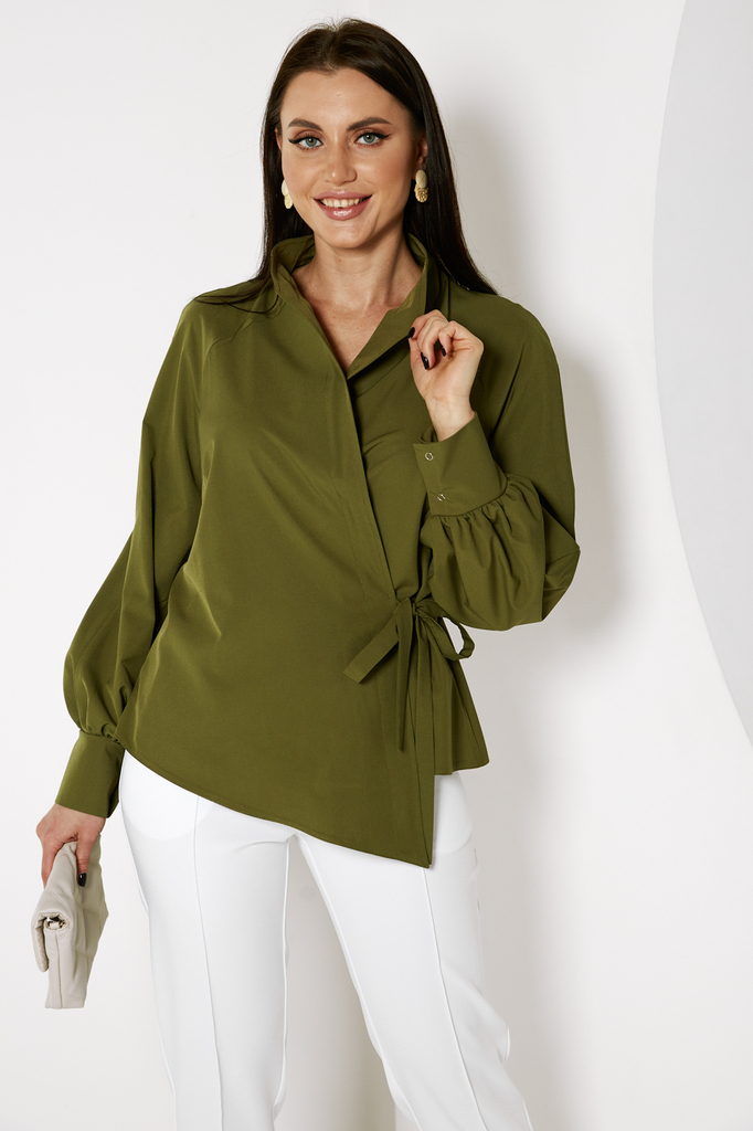Дизайнерская блуза стала настоящим ХИТОМ ПРОДАЖ! Прекрасно комбинируется с любым низом: брюками, джинсами или леггинсами! Дизайнерская блуза, асимметричного кроя, на запахе; Шикарный, пышный, длинный ... Показать описаниерукав, собран внизу манжетой на кнопках; Блуза фиксируется пояском, который продевается в прорезь по боку и завязывается на бант или узел; Ткань: блузочная; Состав: 98 п/э, 2 эластан; Цвет: олива; Размерная линейка 46-56; Длина изделия по спинке: 44 - 57 см, 46 - 58 см, 48 - 58,5 см, 50 - 59 см, 52 - 59,5 см, 54 - 60 см, 56 - 60,5 см; Длина рукава: 44 - 58 см, 46 - 59 см, 48 - 59,5 см, 50 - 60 см, 52 - 61 см, 54 - 62 см, 56 - 63 см; Рекомендована ручная стирка при 30 С; Параметры модели: рост 164, грудь 91 см, талия 64 см, бедра 92 см. На модели представлен 44 размер.